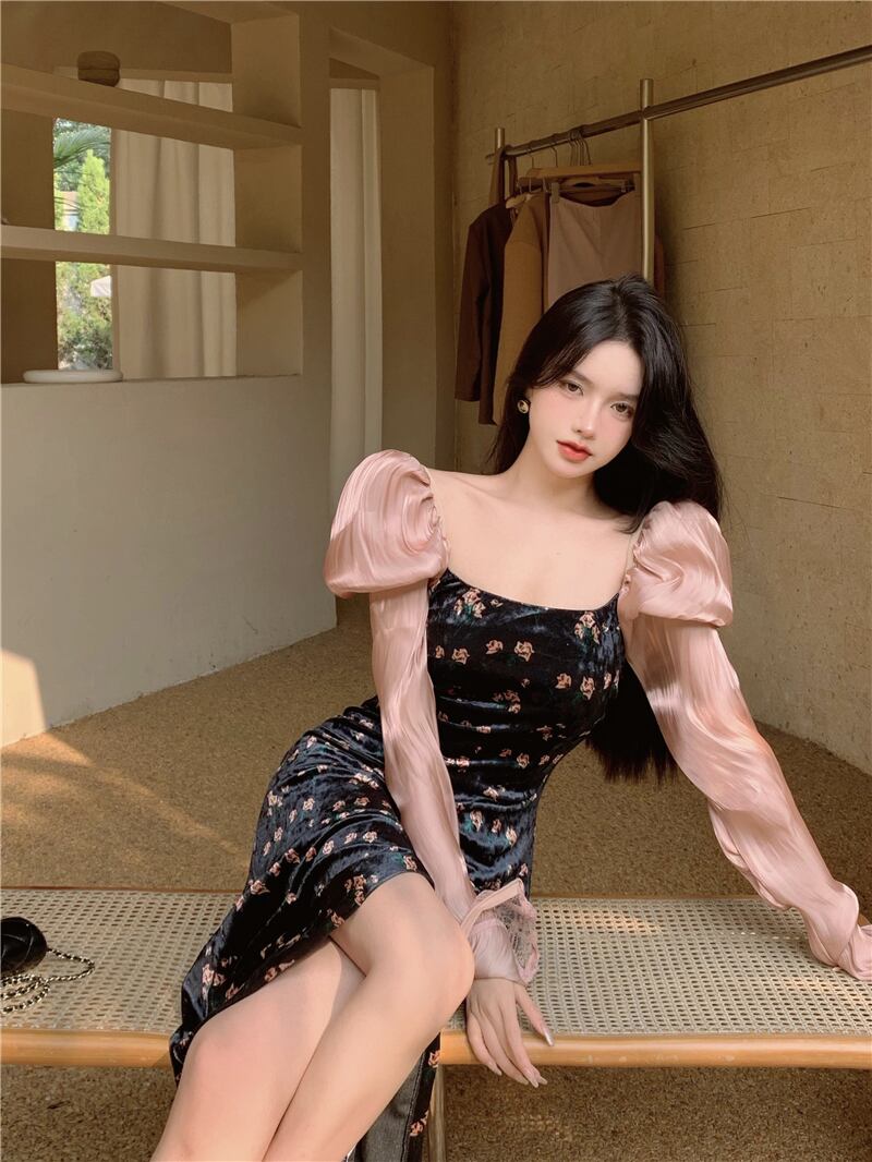 2022 初秋の女性のファッションフレンチ長袖フローラルティーブレークミルク甘いウエストドレスシックなユニークなスカート ロング 大人ガーリー スウィート キュート カジュアル オータム 秋物 花柄 yingd44273789069