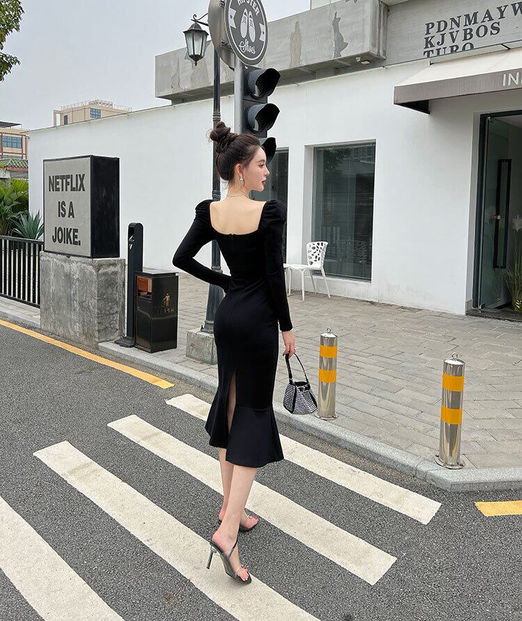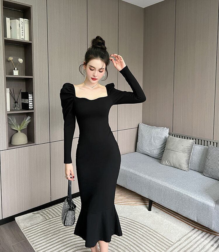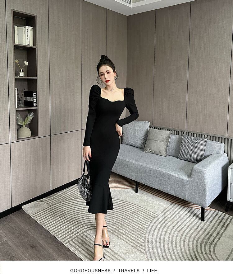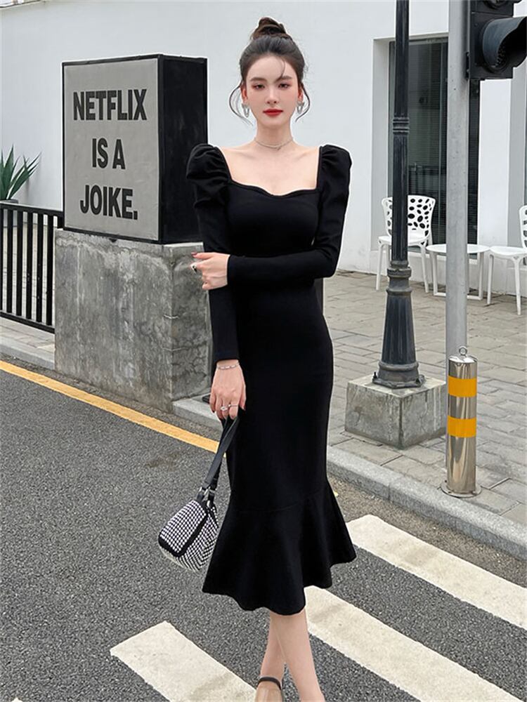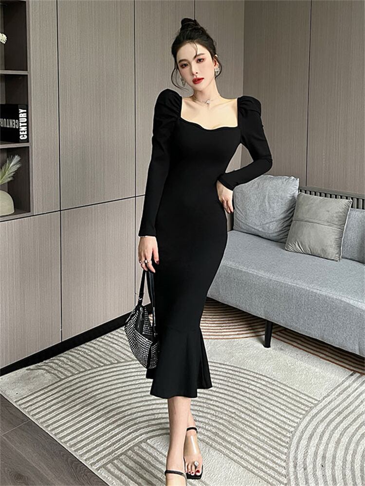 秋のドレスの気質の女神のファンのハイエンドの女性のクールな風の美しい小さなスカートの腰の魚の尾の四角い襟のドレスの女性 オータム 秋物 スクウェア yingd11188636928
