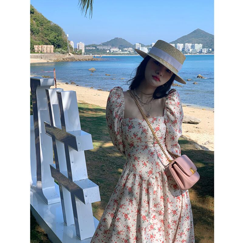 秋の新 2022 フランスの高級婦人服寒風穏やかな風レトロスクエアカラー長袖花柄ドレス ロング オータム 秋物 スクウェア yingd18631224310