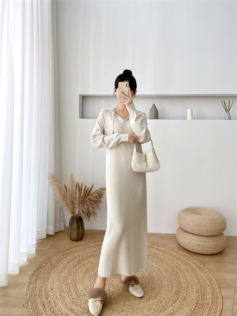 フランスのレトロなロング ニー セーター ドレス ストレート ルーズ怠惰な風フード付きニット ドレス女性の秋と冬 オータム 秋物 ウィンター 冬物 yingd3737206789