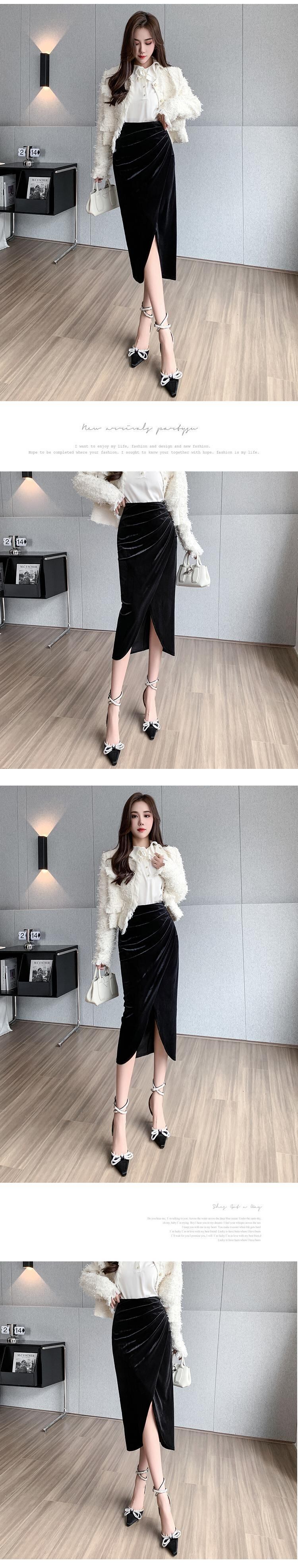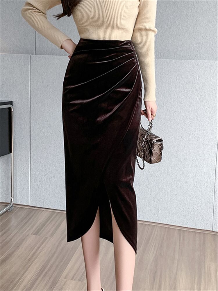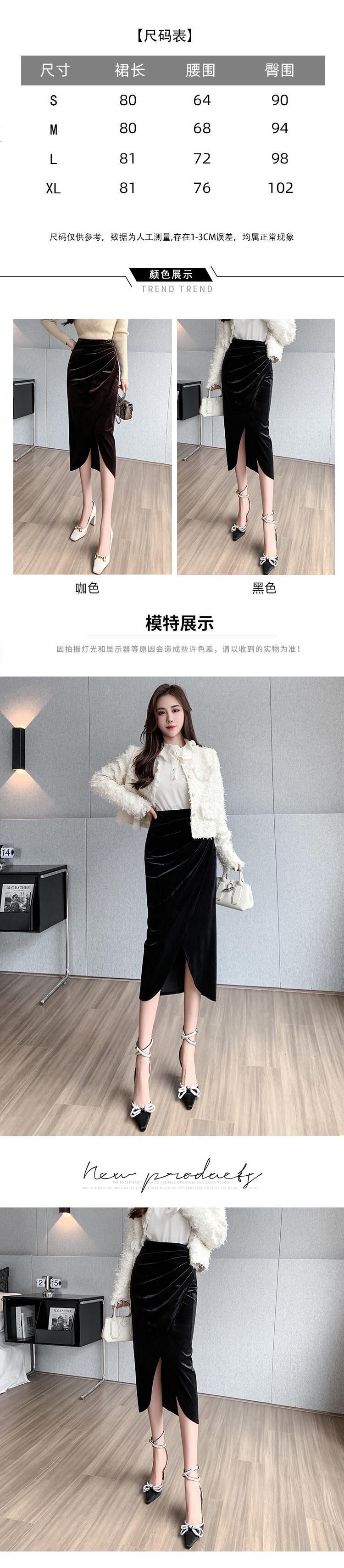 秋と冬の新しいベルベット黒ハイウエスト a ライン スカート女性のプリーツ スプリット ワン ステップ スカート ブラック オータム 秋物 ウィンター 冬物 Aライン yingd9083013543