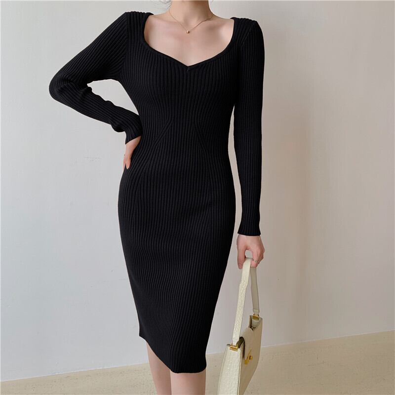 秋の婦人服 2022 新しいフレンチレトロスクエアカラーヘップバーンスタイルのニット長袖ドレス底入れロングスカートトレンド オータム 秋物 スクウェア yingd9778145416