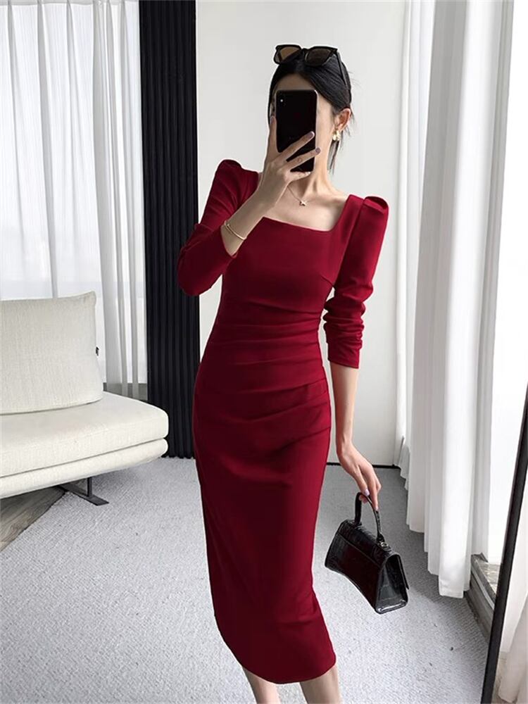 秋の服の気質の女神のファンのハイエンドの婦人服の寒風スリムフィットと薄いヘボンスタイルの赤い長袖のドレスの女性 ロング レッド オータム 秋物 yingd4090629898
