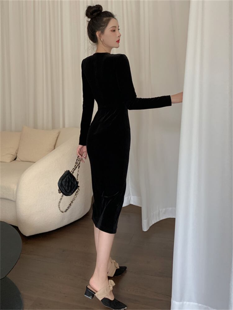 2022 新秋ドレス気質女神ファン長袖ベルベットドレスフレンチヘップバーンスタイルウエストスリットロングスカート女性 オータム 秋物 yingd93838296956