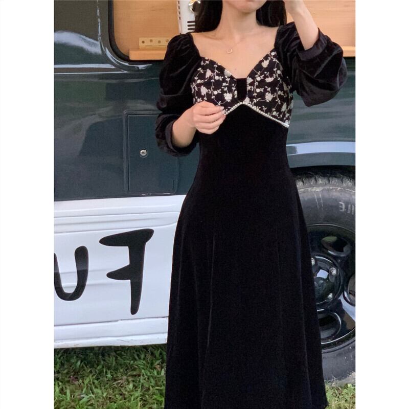 フランスのレトロなヘップバーンスタイルの小さな黒いドレスとウエストと薄い気質の女神ファンのハイエンドの長袖のスクエアネックのベルベットのドレス ロング ブラック スクウェア yingd77820296271