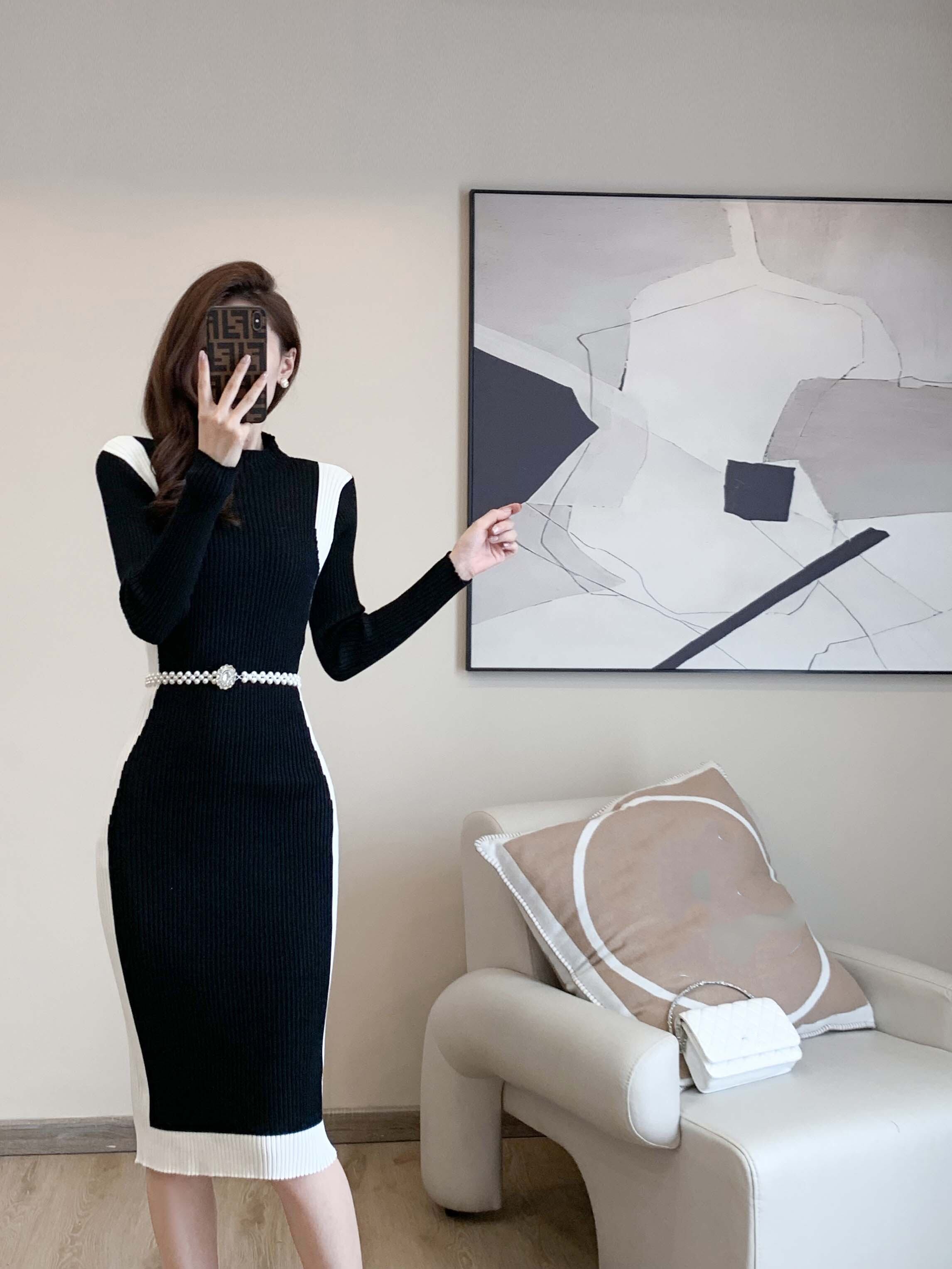 2022 秋と冬の新しいフレンチヘップバーンスタイルニット長袖リトルブラックドレス気質の女神ファンウエストと薄いロングスカートの女性 オータム 秋物 ウィンター 冬物 yingd59008871266