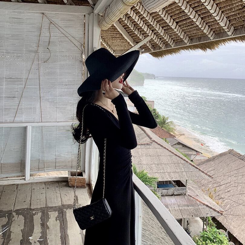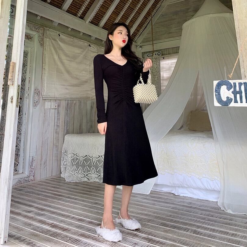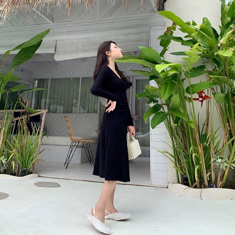 フレンチレトロヘボンスタイルロング膝上セータードレススリムセクシーなVネック初秋ハイエンド気質ドレス女性 オータム 秋物 yingd43595219130