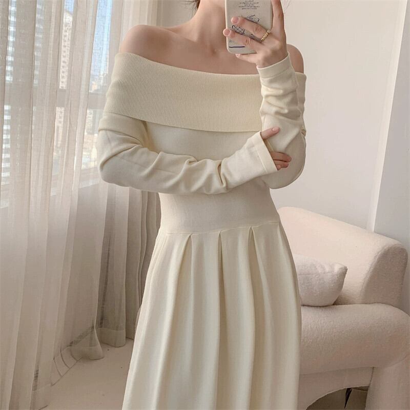 シックでユニークなウエストロングスカート新しい2023スタイルハイコールドロイヤルシスタースタイルデザインセンスワンショルダーニットドレス yingd75692476289