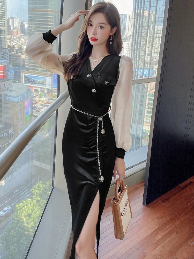 2023 秋の新作シックでユニークなスカートウエストデザインニッチセクシーなスリット長袖ベルベットドレス ロング オータム 秋物 yingd34726819110