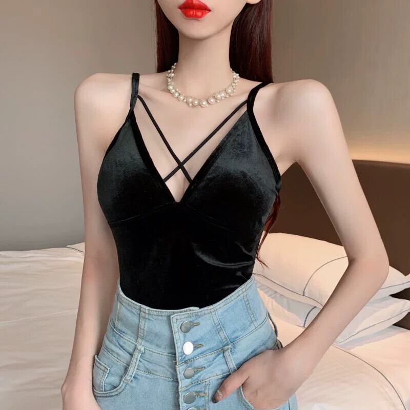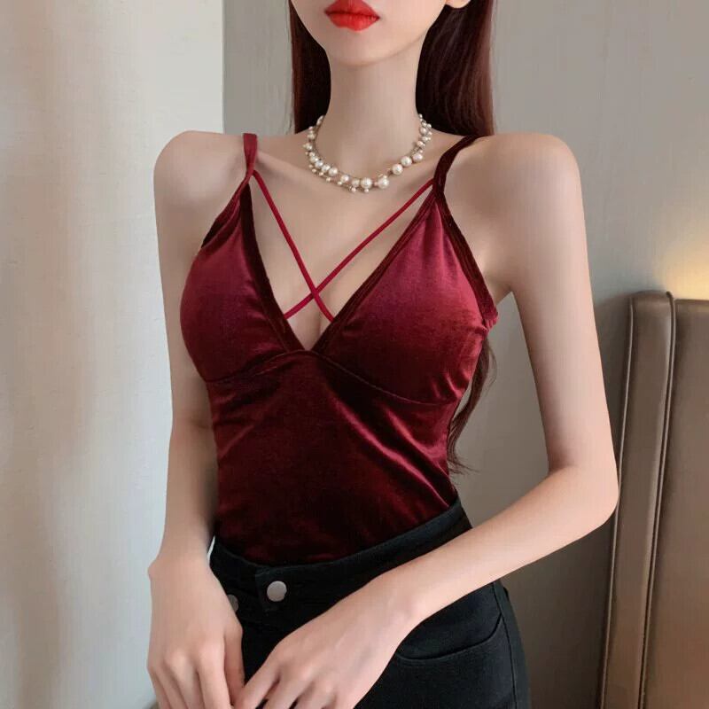 フレンチ V ネック クロス中空ベルベット キャミソール レディース インナー おしゃれ アイン スタイル おしゃれ ワンピース トップス 胸パッド付き Vネック yingd18785505742