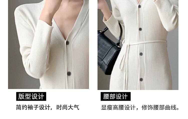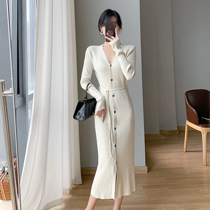ミドル丈の膝上セータードレス秋冬コート風シックなウエストベルト付きVネックニットワンピース オータム 秋物 ウィンター 冬物 ハーネス yingd31713353861