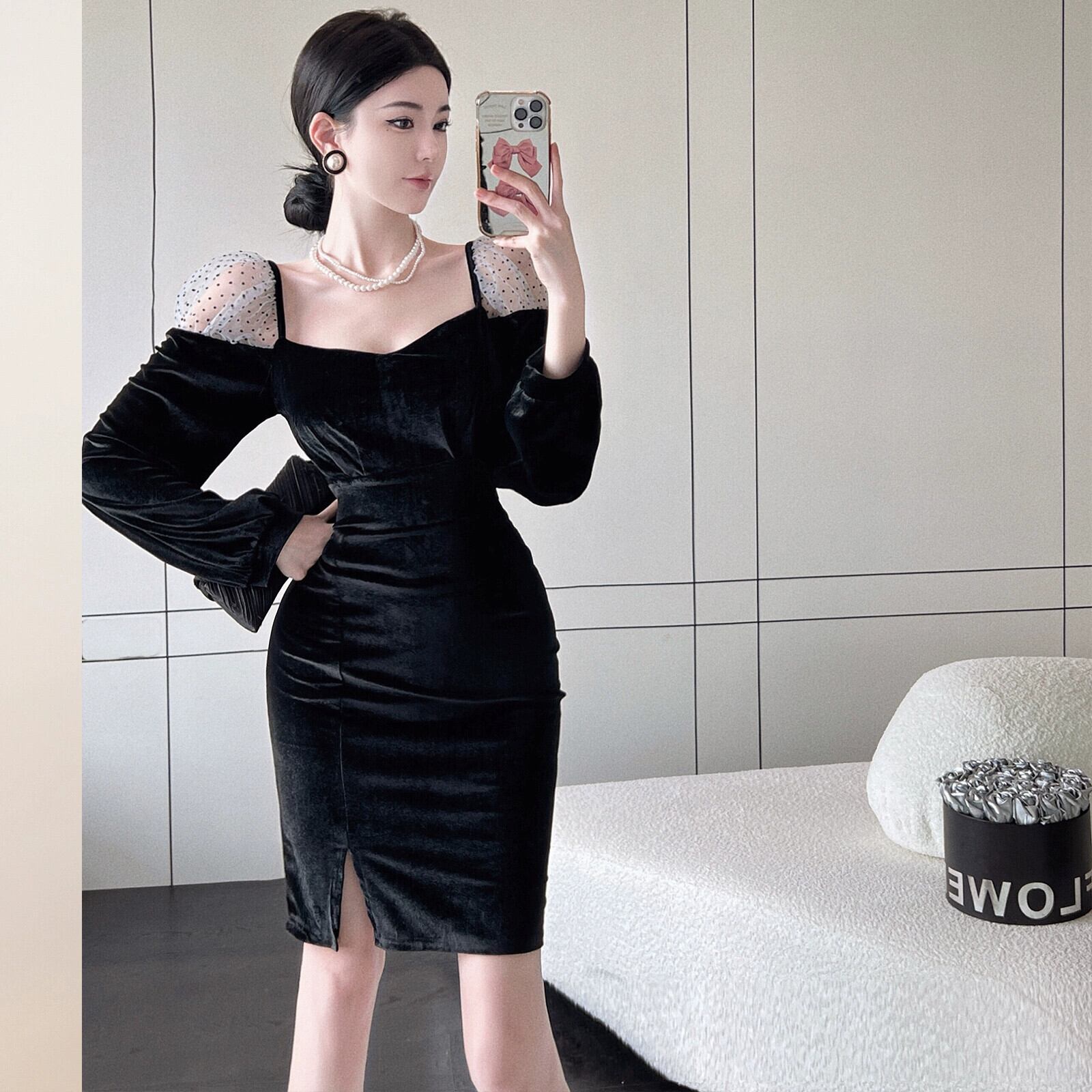 秋の気質女神ファンメッシュステッチ長袖スクエアカラーベルベットドレスウエストバッグヒップヘップバーンスタイルリトルブラックドレス ロング オータム 秋物 スクウェア yingd42993371690