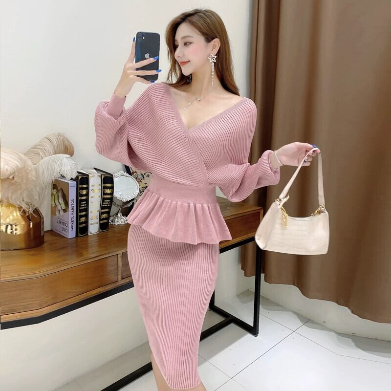 ニットスーツの女性の 2023 新スタイル Yujie ライトおなじみのスタイル V ネックセーターセクシーなバッグヒップスカートツーピース女性 Vネック yingd42343766374