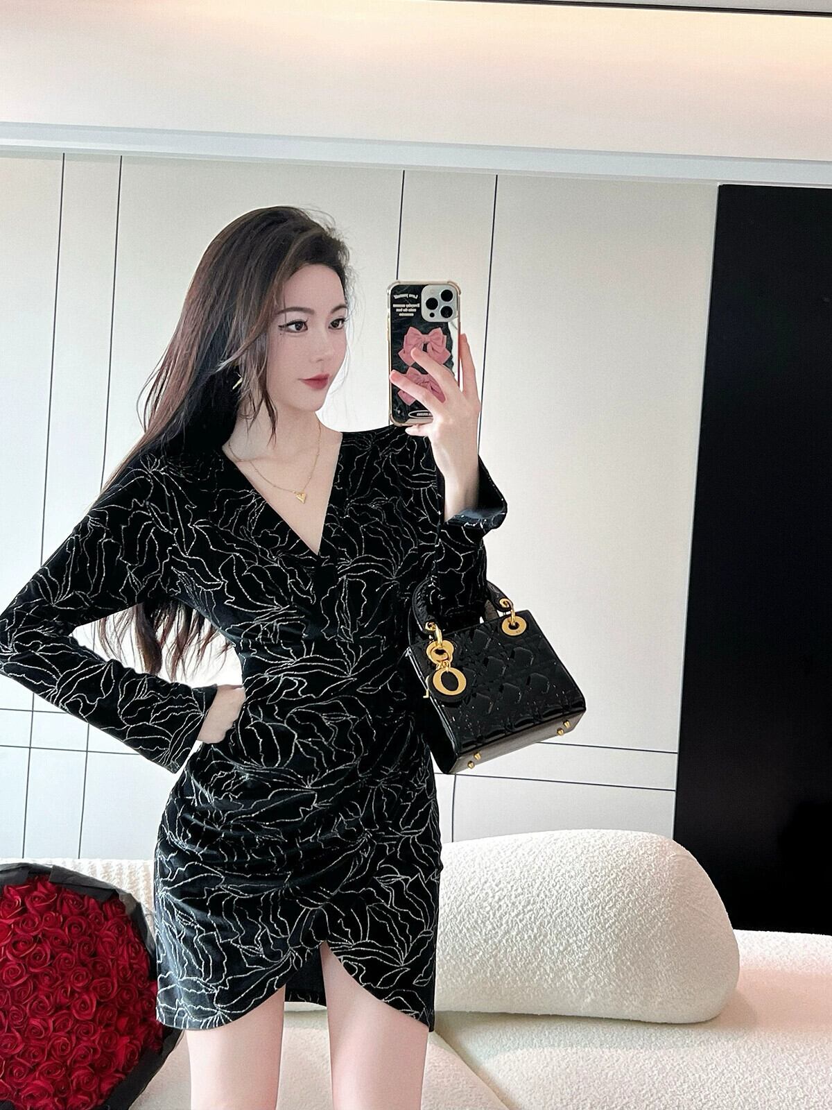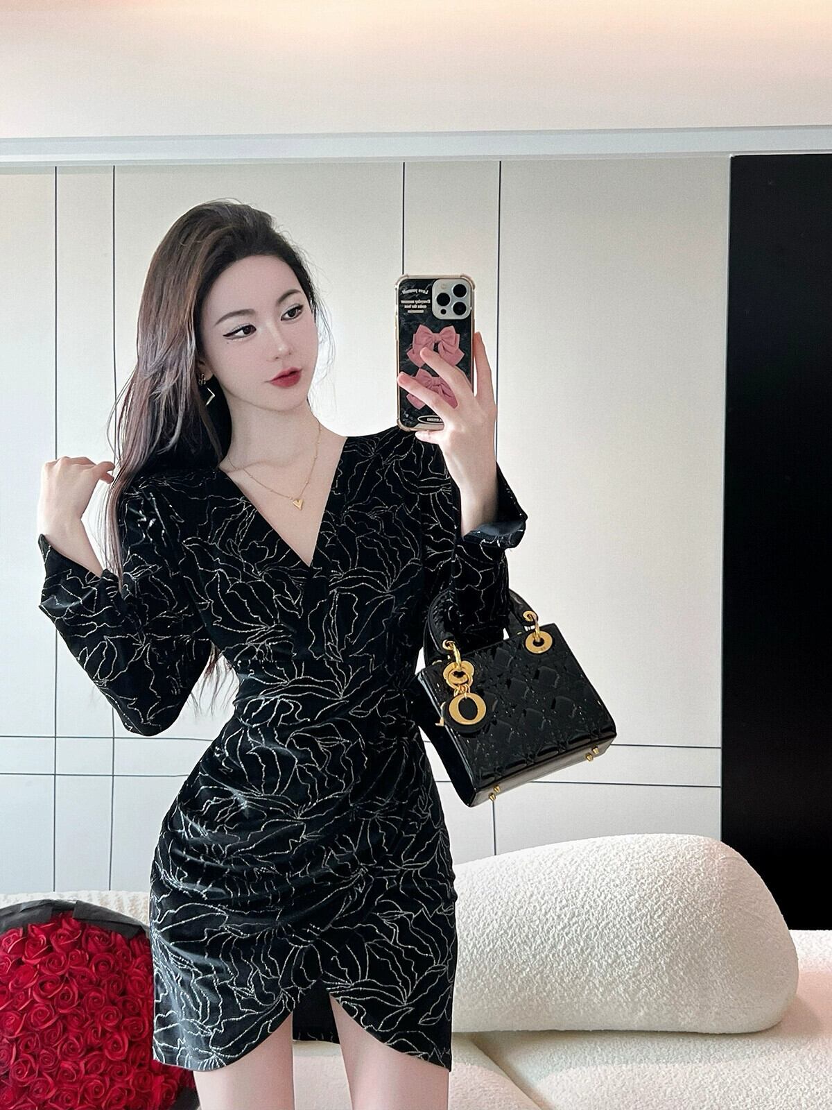 秋の気質の女神スタイルのハイエンドヘボンスタイル長袖Vネックベルベットドレスセクシーなハイウエストバッグヒップスカート ハイウェスト ロング オータム 秋物 yingd88579300103