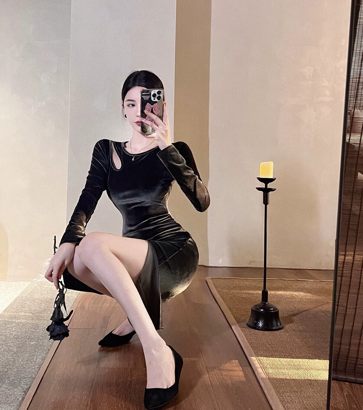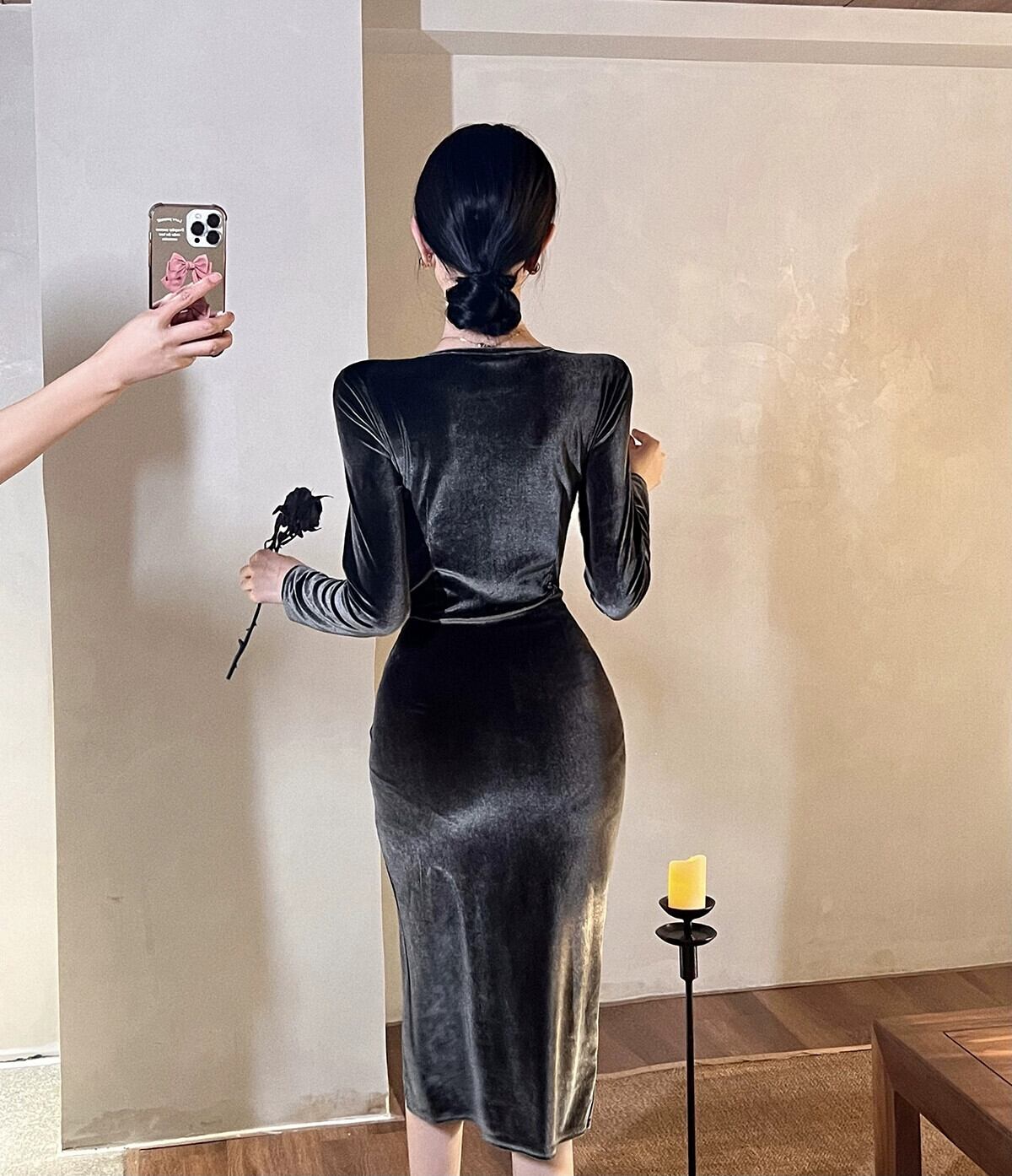 気質セレブリトルブラックドレスロイヤルシスターライトおなじみのスタイル自己修養スリムセクシーなスリットバッグヒップベルベットドレス女性の秋と冬 オータム 秋物 ウィンター 冬物 yingd64358627451