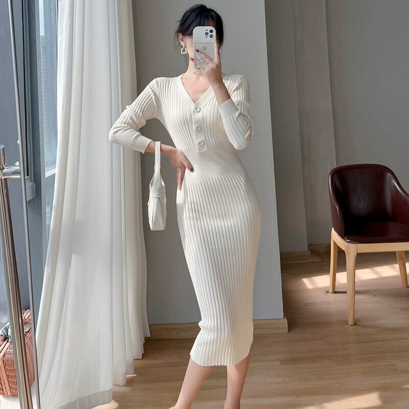 秋冬高級感婦人服冷風長袖ニットVネックブラックドレスヘボン風スリムウエストドレス ロング オータム 秋物 ウィンター 冬物 yingd55145018318