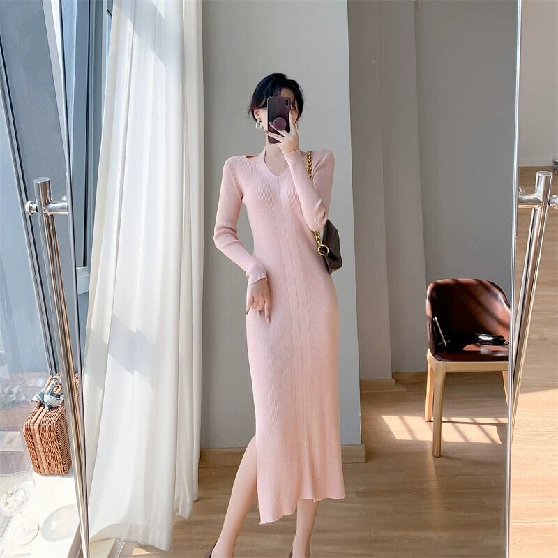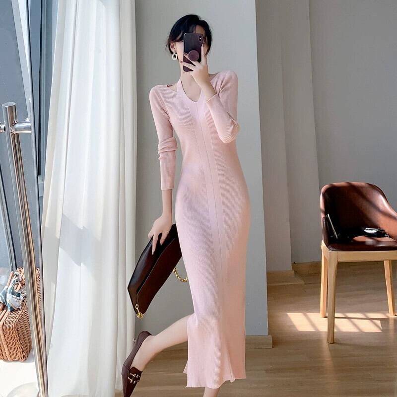 高級感とエレガントな雰囲気のロングスカート。 -エンドスカート。スリムで薄い。ヒップと内側がセクシーなVネックバッグ。ニットワンピース yingd19768396336