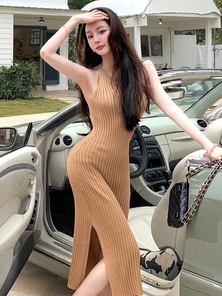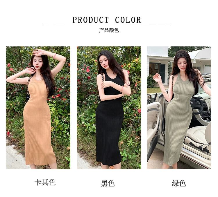 スカート女性の夏のウエスト痩身気質セレブセクシーな背中の開いたスリットニットベストキャミソールドレス女性 サマー 夏物 yingd41841747497