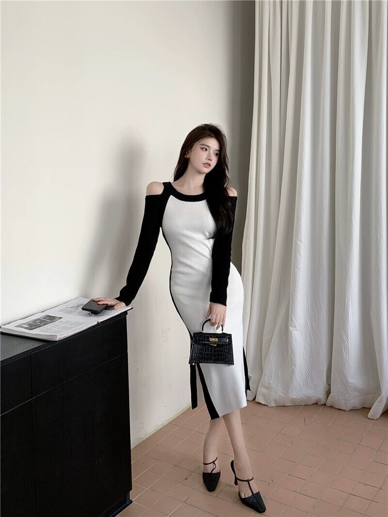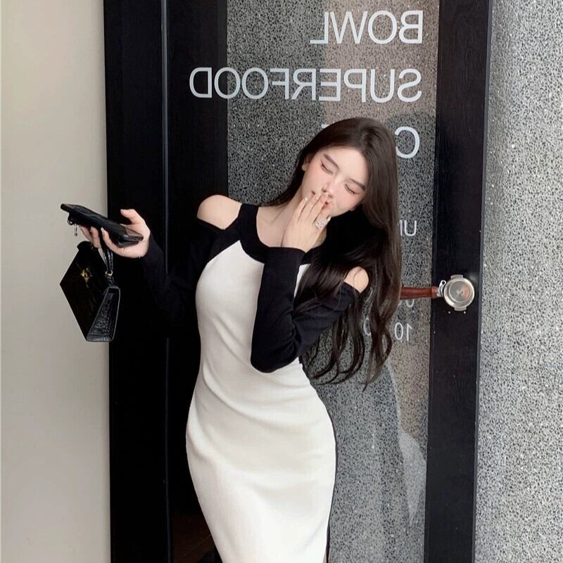 コート付きニットウエストロングスカート、ハイエンドの気質、社交家、セクシーなオフショルダー長袖セータードレス、秋と冬の女性 オータム 秋物 ウィンター 冬物 yingd88111140133