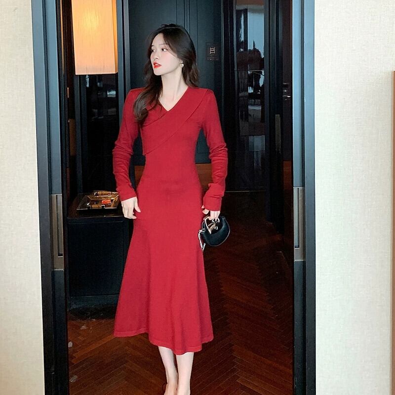 ロングセータースカート秋冬コートバージョン気質セレブライト高級高級感インナーニットドレス女性 オータム 秋物 ウィンター 冬物 yingd6078854504