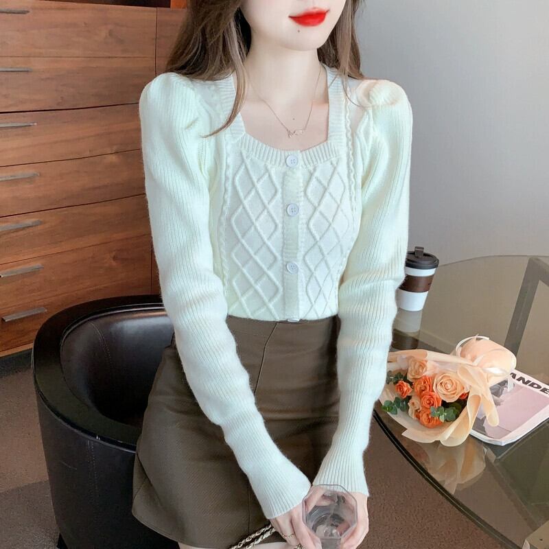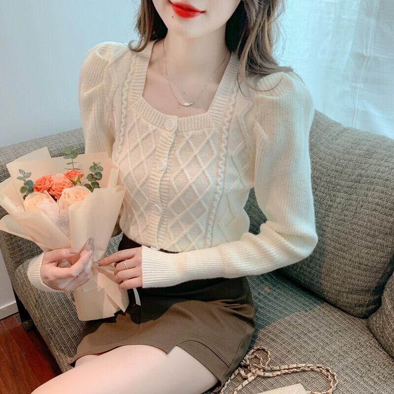 厚手のセーターボトリングシャツ女性の秋冬高品質スクエアカラーパフスリーブカーディガンニットジャケット女性のユニークな小さなトップ オータム 秋物 ウィンター 冬物 スクウェア yingd54489197420