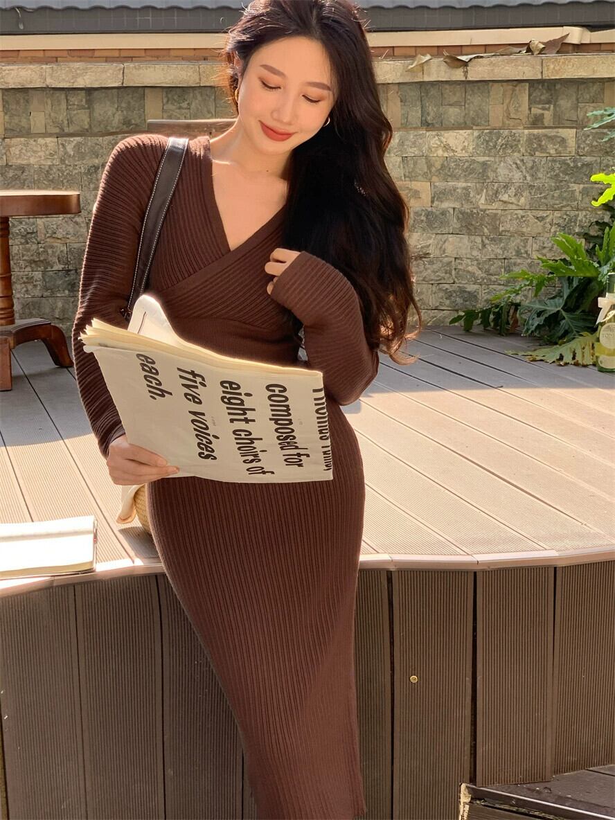裕福な家族の娘のスカート秋と冬のロングスカートハイエンドの気質セレブセクシーな V ネックバッグヒップニットドレス女性 オータム 秋物 ウィンター 冬物 Vネック yingd26150842105