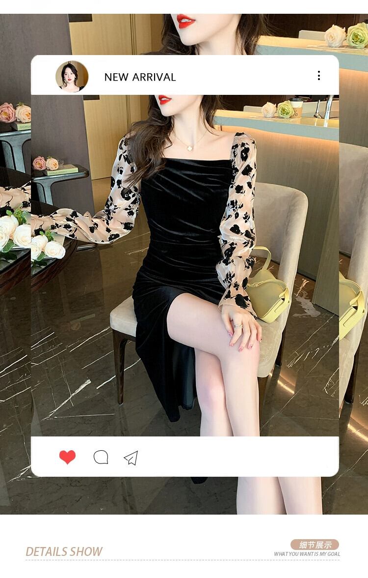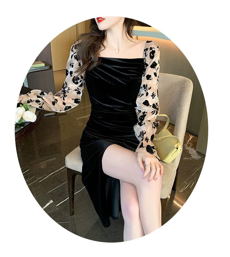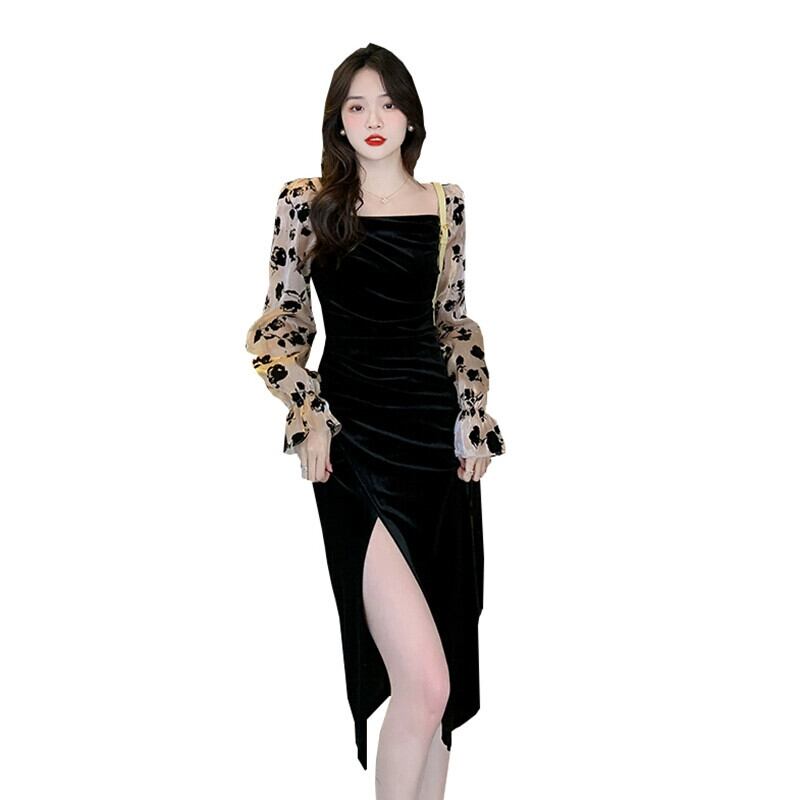 シックなウエストスリットロングスカート新 2023 スタイル長袖メッシュステッチベルベットスクエアカラードレス女性の秋と冬 オータム 秋物 ウィンター 冬物 スクウェア yingd5112198466