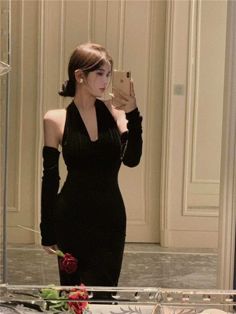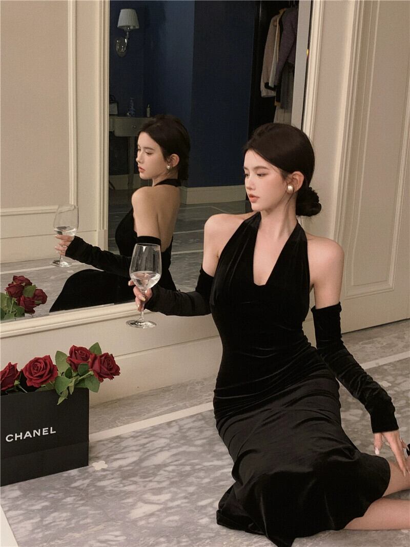 フィッシュテールロングスカートハイエンドの気質レディースライト高級レディースデザインセンスぶら下げネックベルベットドレスドレス女性の秋と冬 オータム 秋物 ウィンター 冬物 yingd73109230289