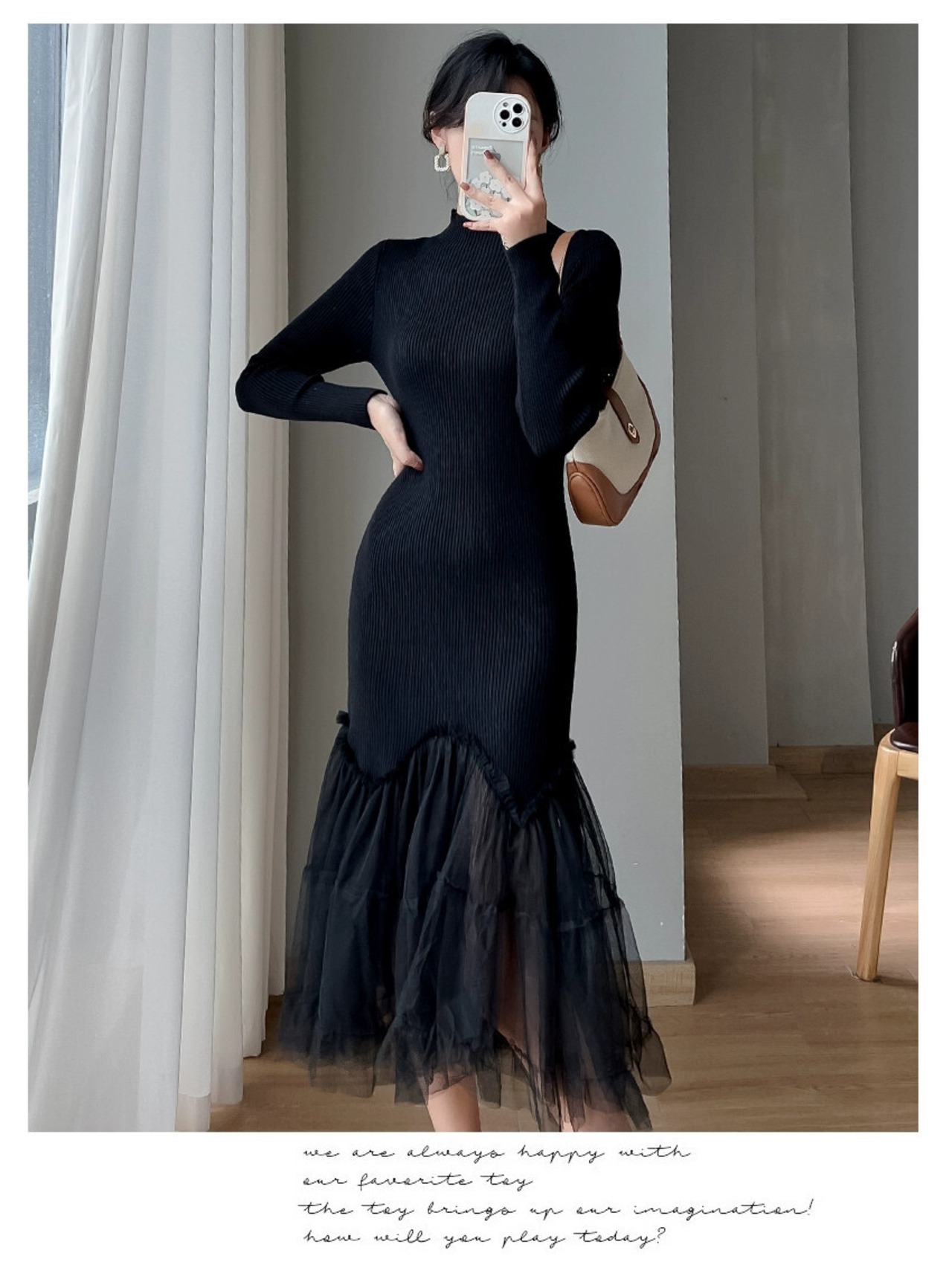 フレンチレトロな秋冬メッシュステッチニット長袖ハーフハイカラードレススリムウエストマーメイドスカート ロング オータム 秋物 ウィンター 冬物 yingd84129925281