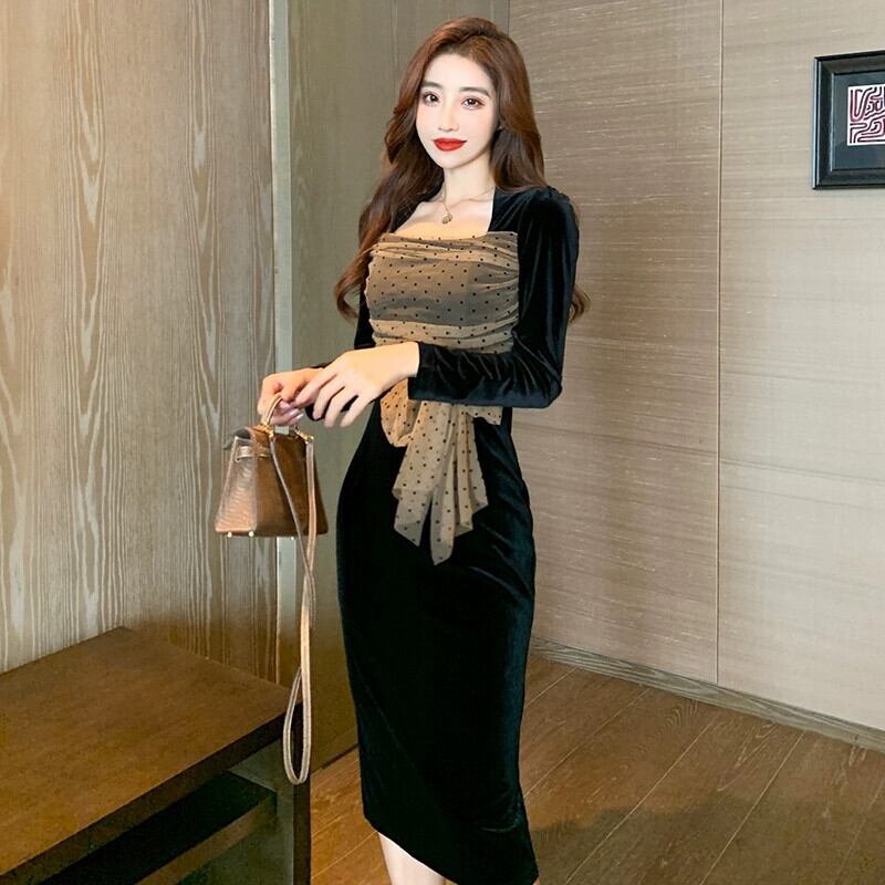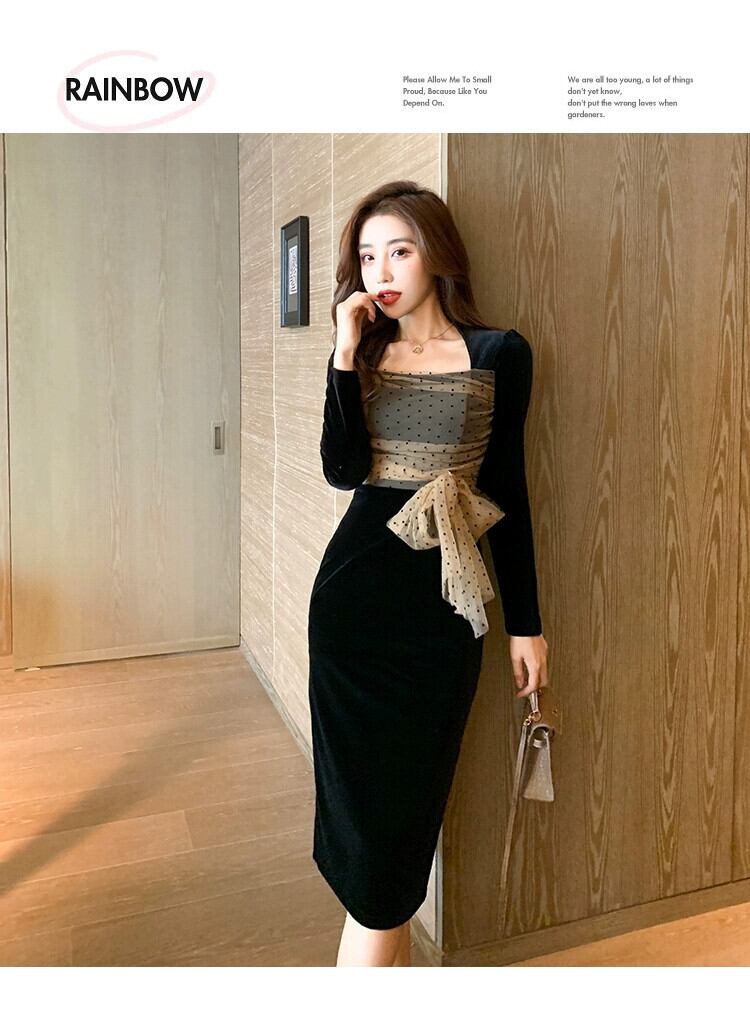 スカート女性の秋と冬のシックでユニークなデザインセンスニッチメッシュステッチベルベット長袖ハイコールドインペリアルシスタースタイルドレス ロング オータム 秋物 ウィンター 冬物 yingd94540448817