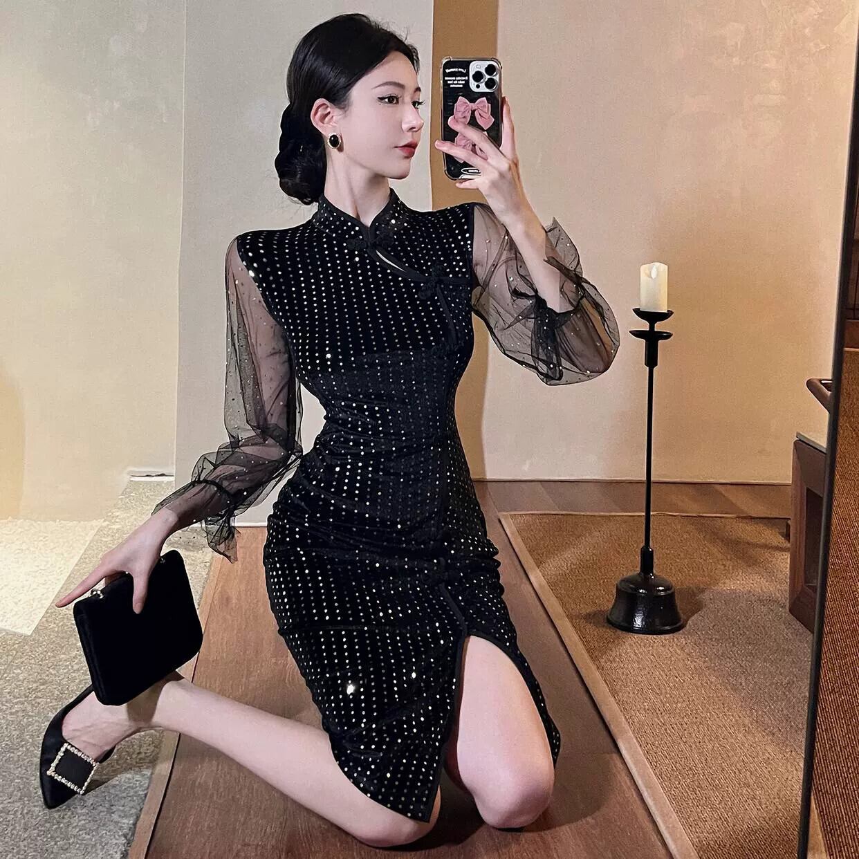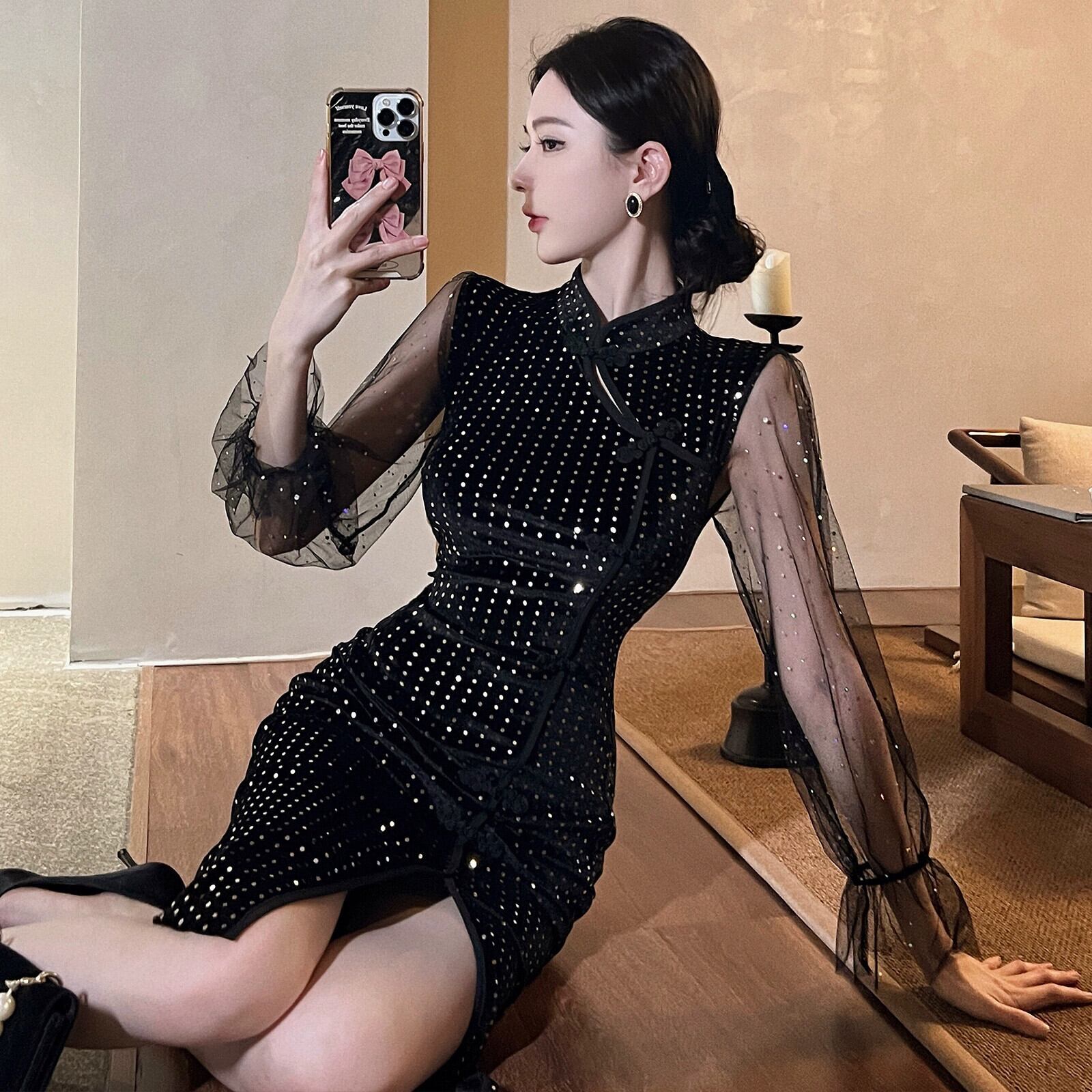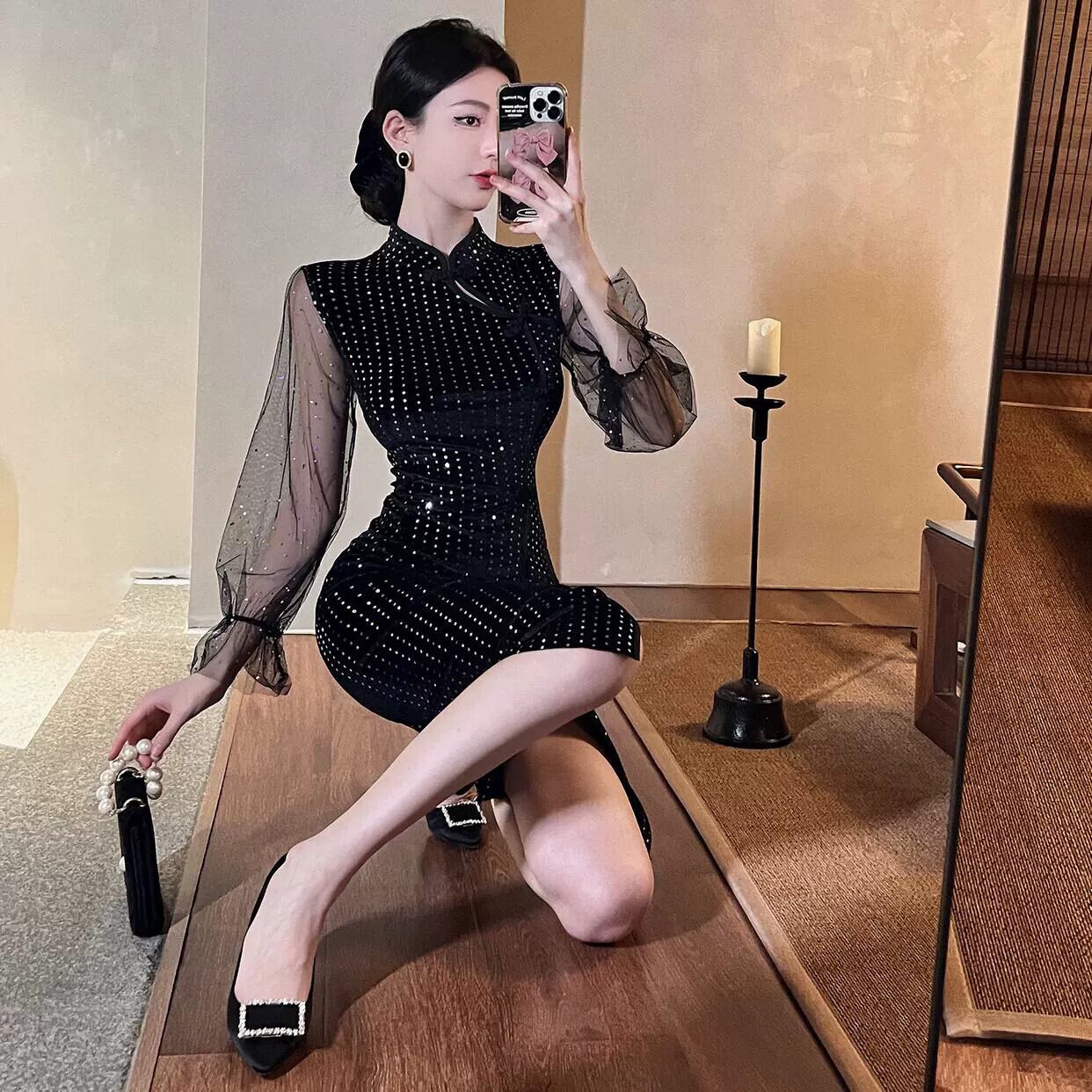 フランスのレトロなベルベットのスパンコールスプライシング秋ドレス気質女神ファン改良版のスリットチャイナドレスボトリングドレス潮 オータム 秋物 yingd38689663267