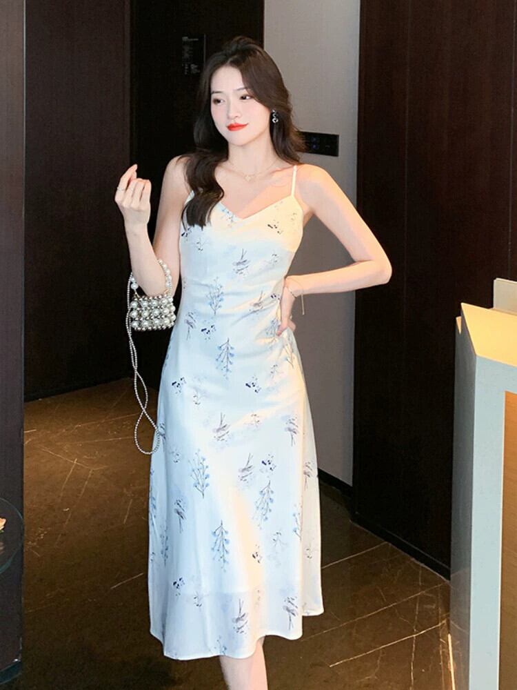 -エンドプリントサテンサスペンダースカートレディースニッチデザイン自己修養気質花柄ドレス2023新 yingd2788737414
