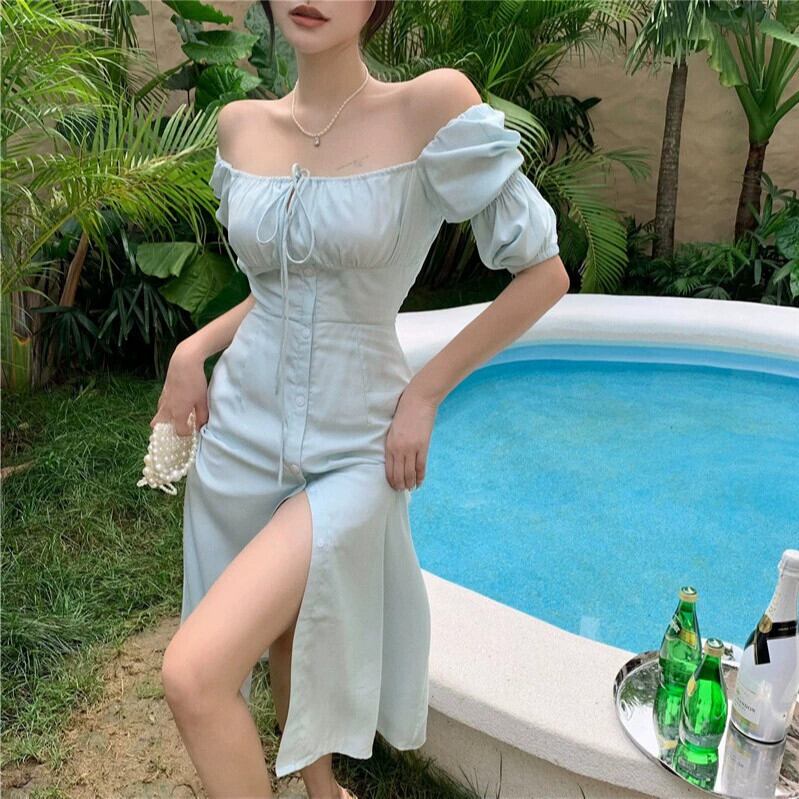パフスリーブハイウエストドレスレディースサマードローストリングデザインセンスフレンチスクエアカラースリムミッドレングスシーサイドホリデードレス ハイウェスト 夏物 スクウェア yingd97022604156