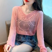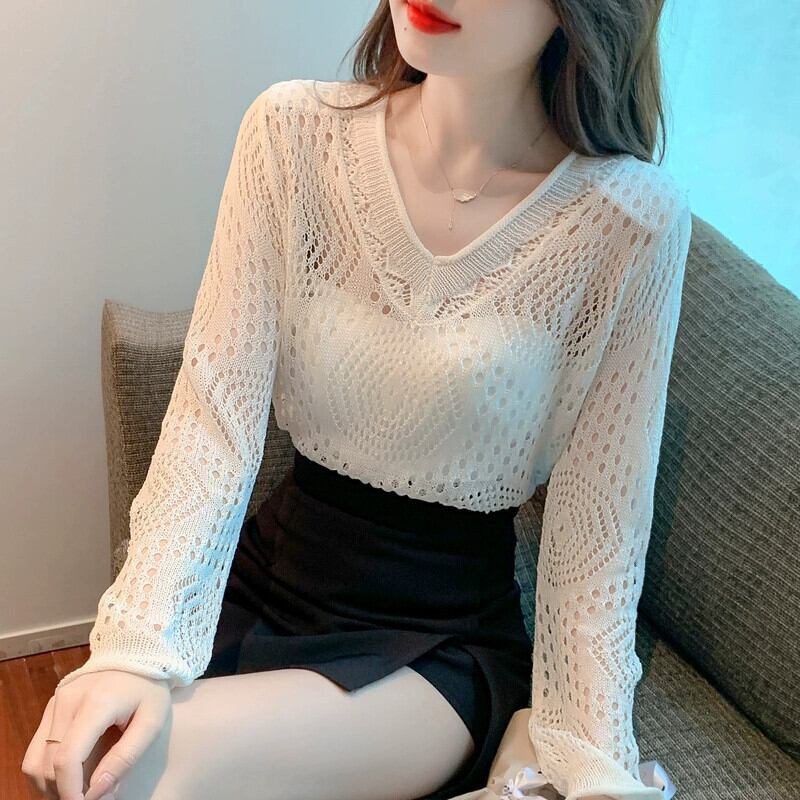 コールドスタイルのユニークなシックなトップ 2023 新しい長袖アイスシルク日焼け止めブラウス慎重な機械中空ニットセーター女性 ロング yingd17664391051
