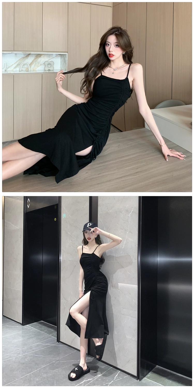 フランスの純粋な欲望スタイルの黒のスリングドレスニッチデザインセンス巾着スリットスリングドレス 2023 女性の新しいスタイル ブラック ピュア yingd58323817964