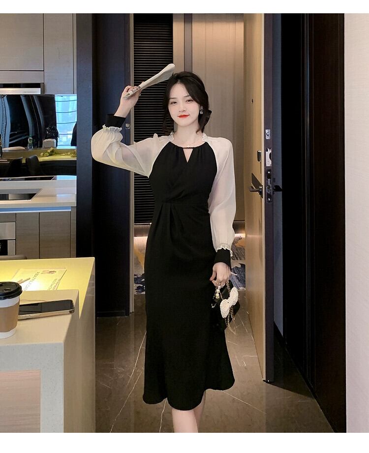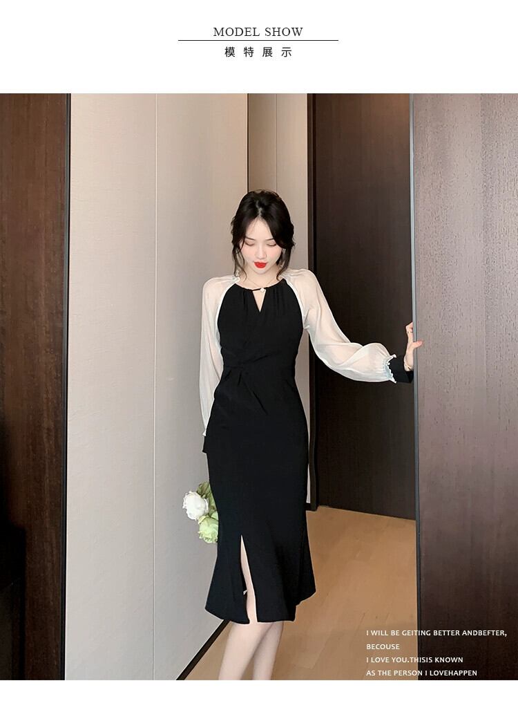 春の女性の 2023 新しい気質レディーススリットドレス女性のデザインセンスボタンヒットカラー長袖スカート ロング スプリング 春物 yingd10777535699