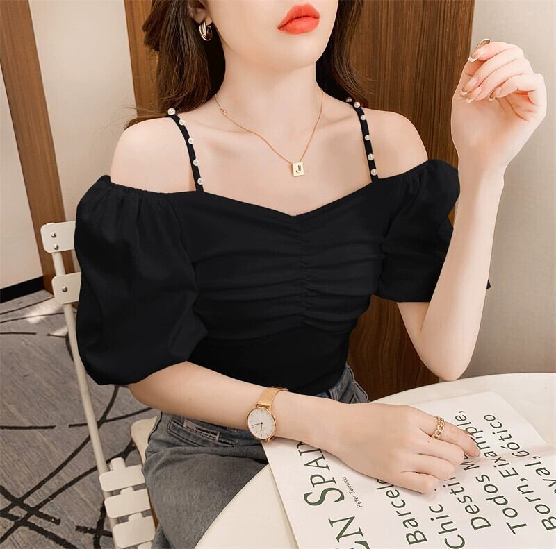 シックなハイエンド鎖骨トップ 2023 夏の新純粋な欲望スタイルのセクシーなパフスリーブストラップレス半袖 tシャツ女性 サマー 夏物 ピュア yingd34415641086