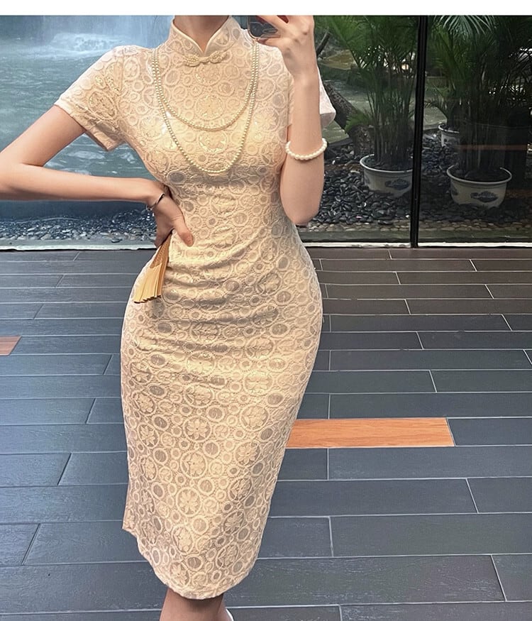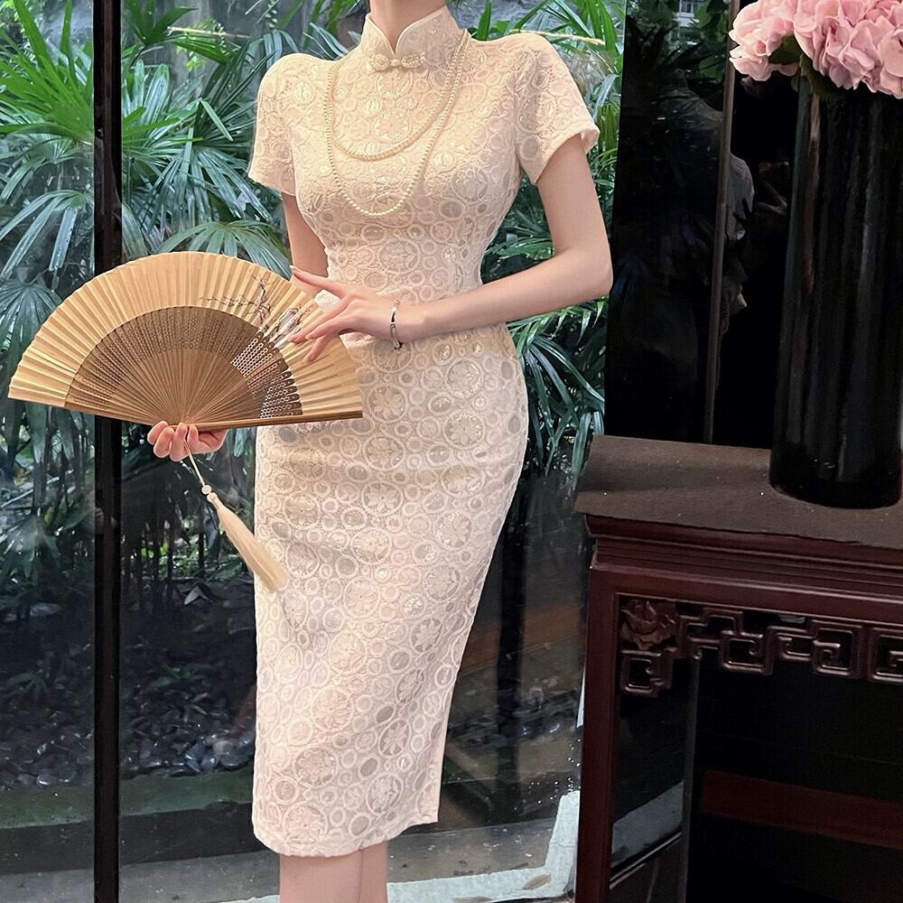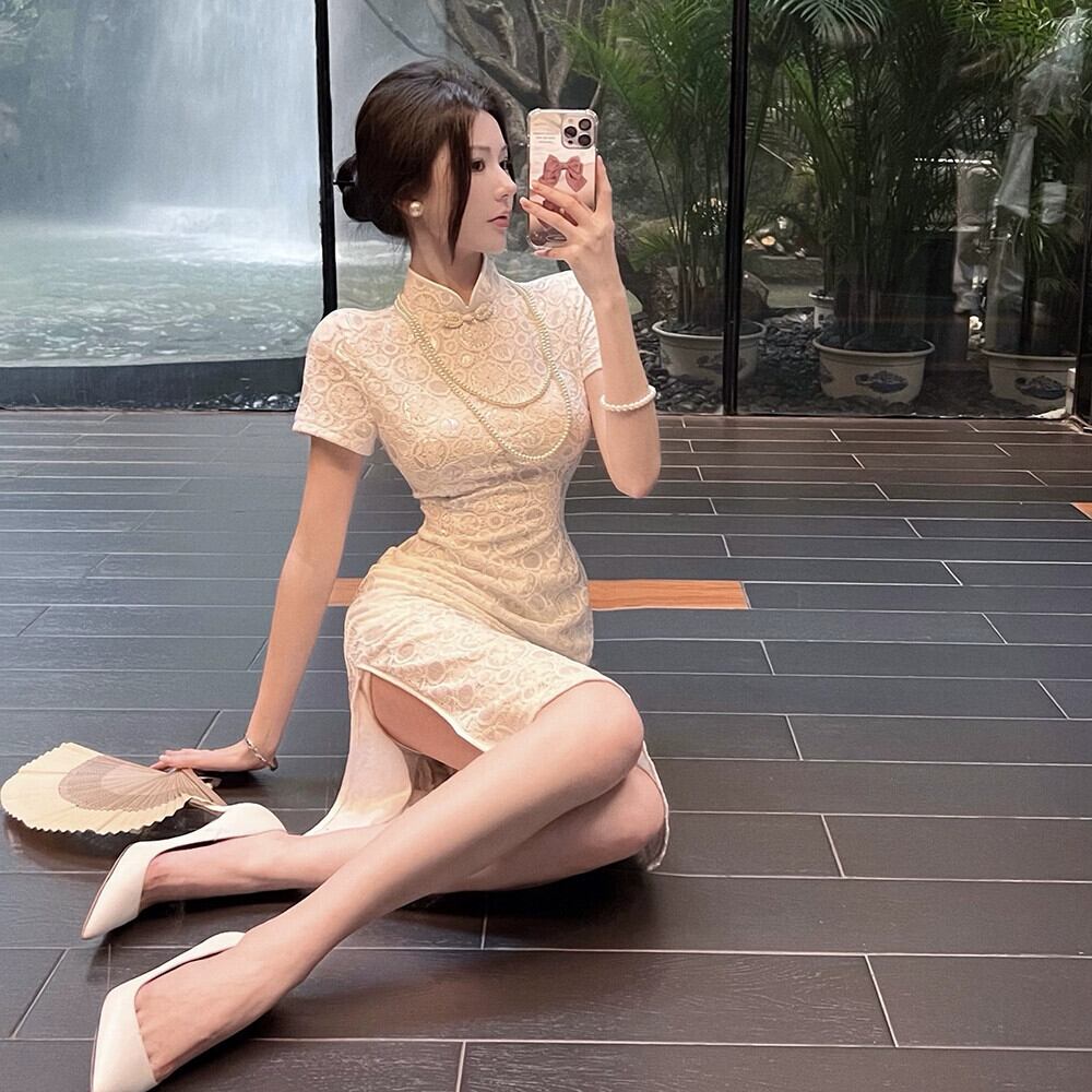 -end 女性の軽い豪華な新しい中国風チャイナ ドレス スリム フィット セクシー バッグ ヒップ スリット レース改良されたチャイナ ドレス yingd40112537108
