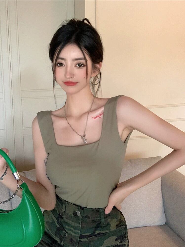 2023 夏のアイスシルクベストスクエアカラースリムアウター機能的なスタイルスパイスガールショートトップスキャミソール女性のインナーウェア サマー 夏物 スクウェア yingd85987973718