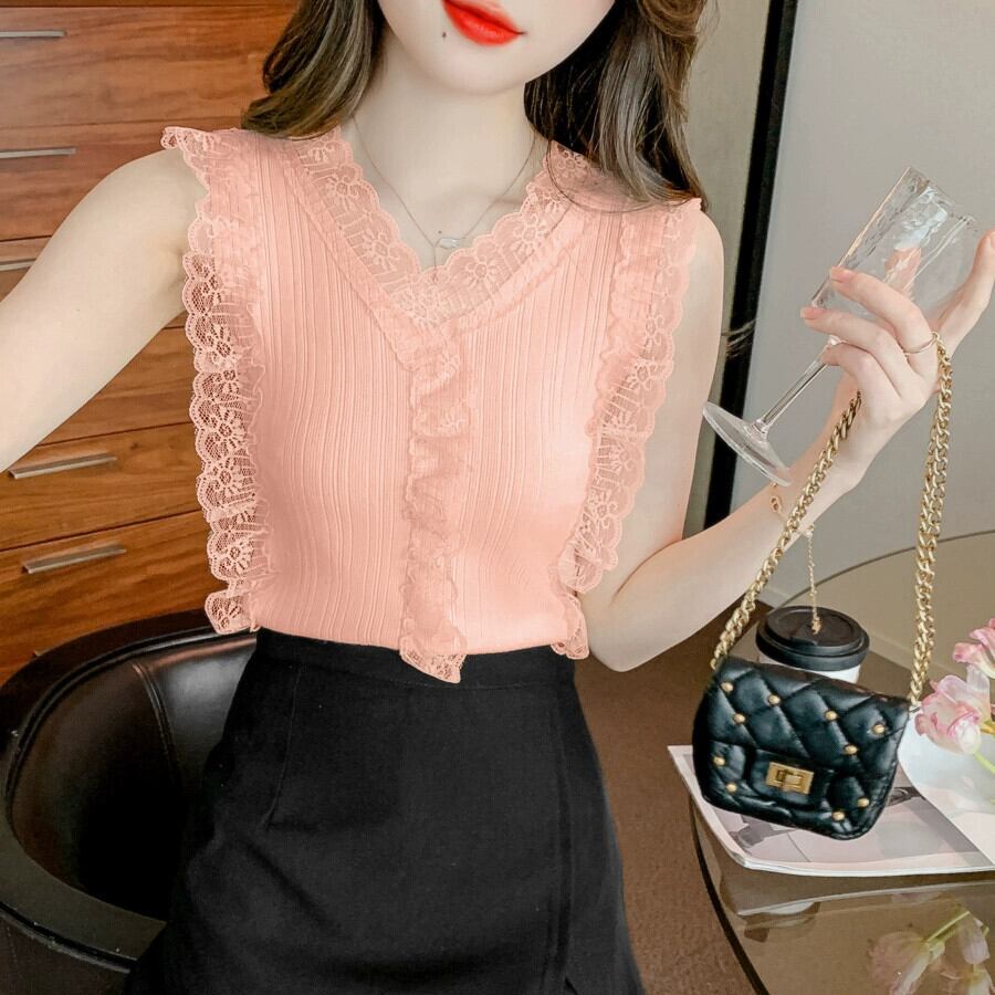 フレンチ甘辛トップスデザインセンスニッチレースステッチニットキャミソールレディースインナーノースリーブボトムシャツ 大人ガーリー スウィート キュート カジュアル yingd47609497876