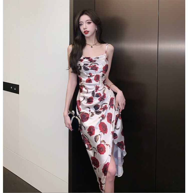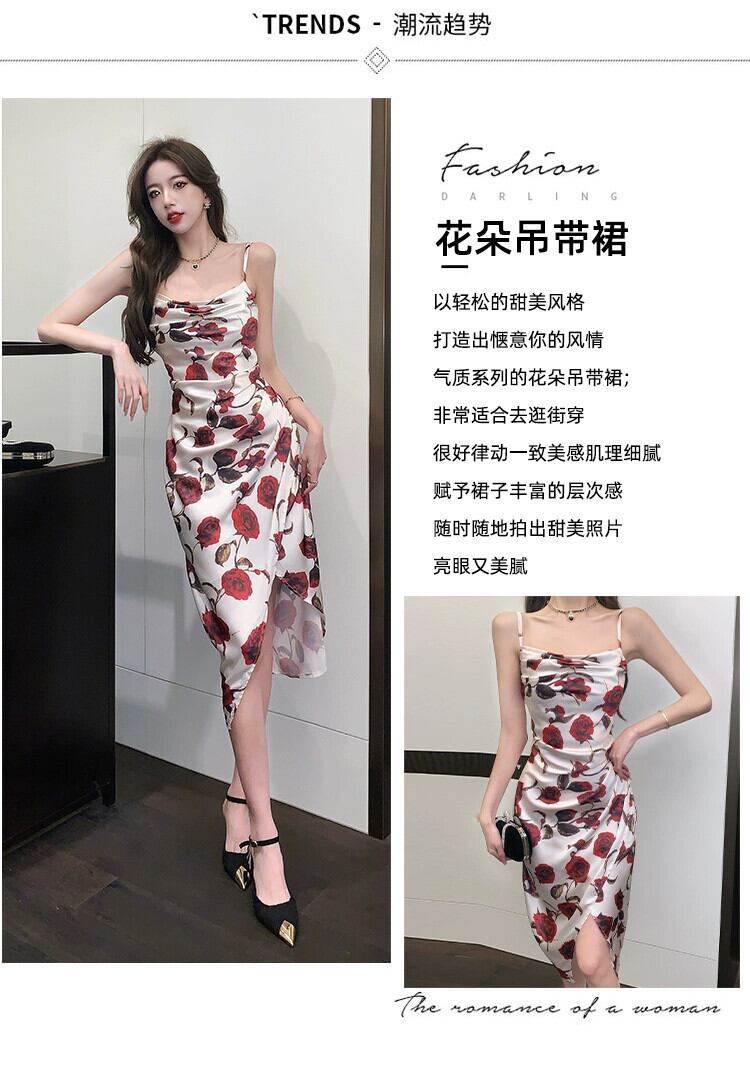 ティーブレイクフレンチサスペンダースカートウエストスリム気質セレブサテン花柄サスペンダードレス 2023 女性の新スタイル yingd39456799564
