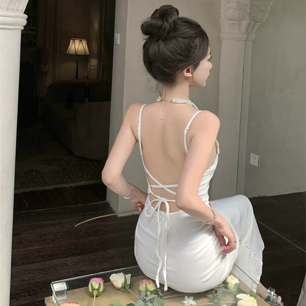 2023新しいスタイルの白いスリングドレス、ハイエンドのウエストラインと薄い気質のセクシーなバックレスストラップホリデードレス ホワイト yingd52545907781