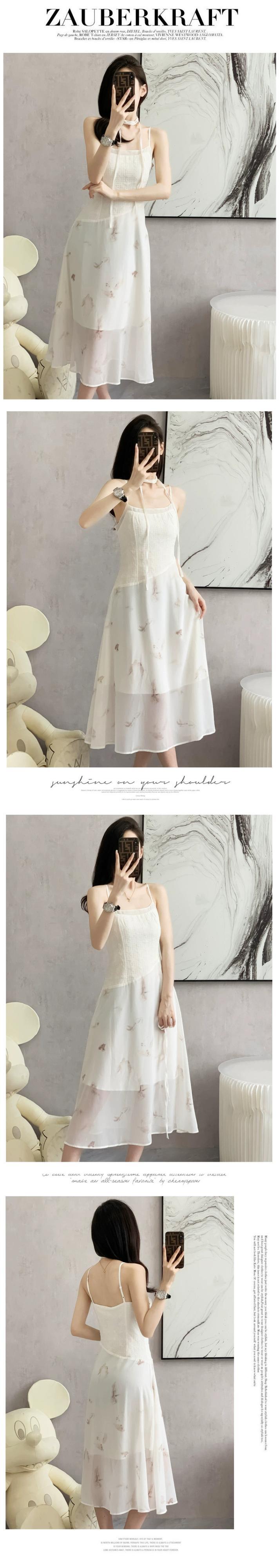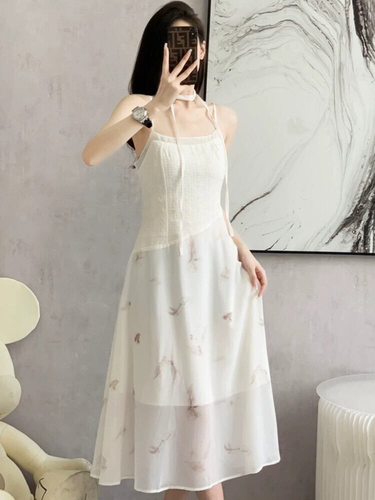 ティーブレイクフレンチインクプリントサスペンダースカート女性のニッチデザインウエストステッチドレス 2023 女性の新スタイル yingd60558153154