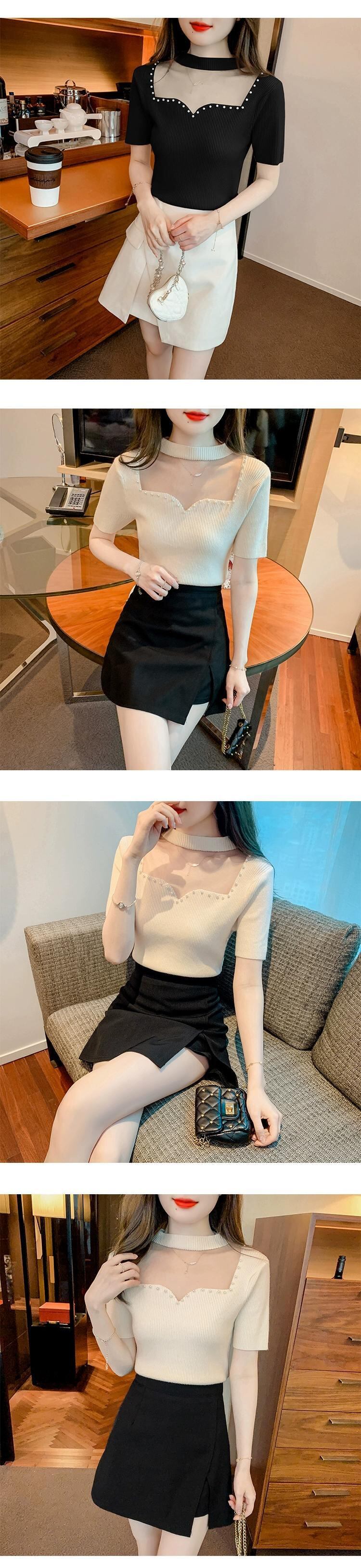 ユニークなトップ超格好良い年齢軽減半袖 tシャツ女性 2023 新デザインセンスオーガンジーステッチニットセーター女性 yingd90140890293