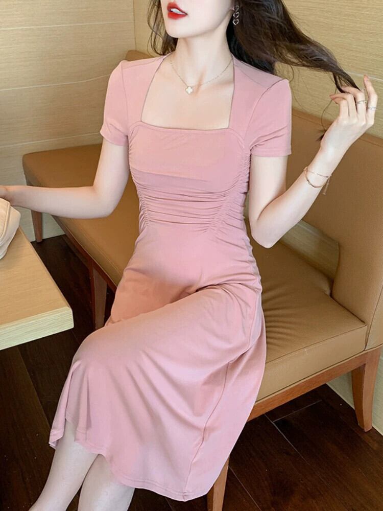シックでユニークなスカートの質感のハイエンドの淑女のような気質を身に着けているデザインプリーツスクエアカラードレス2023新しい スクウェア yingd32175314964