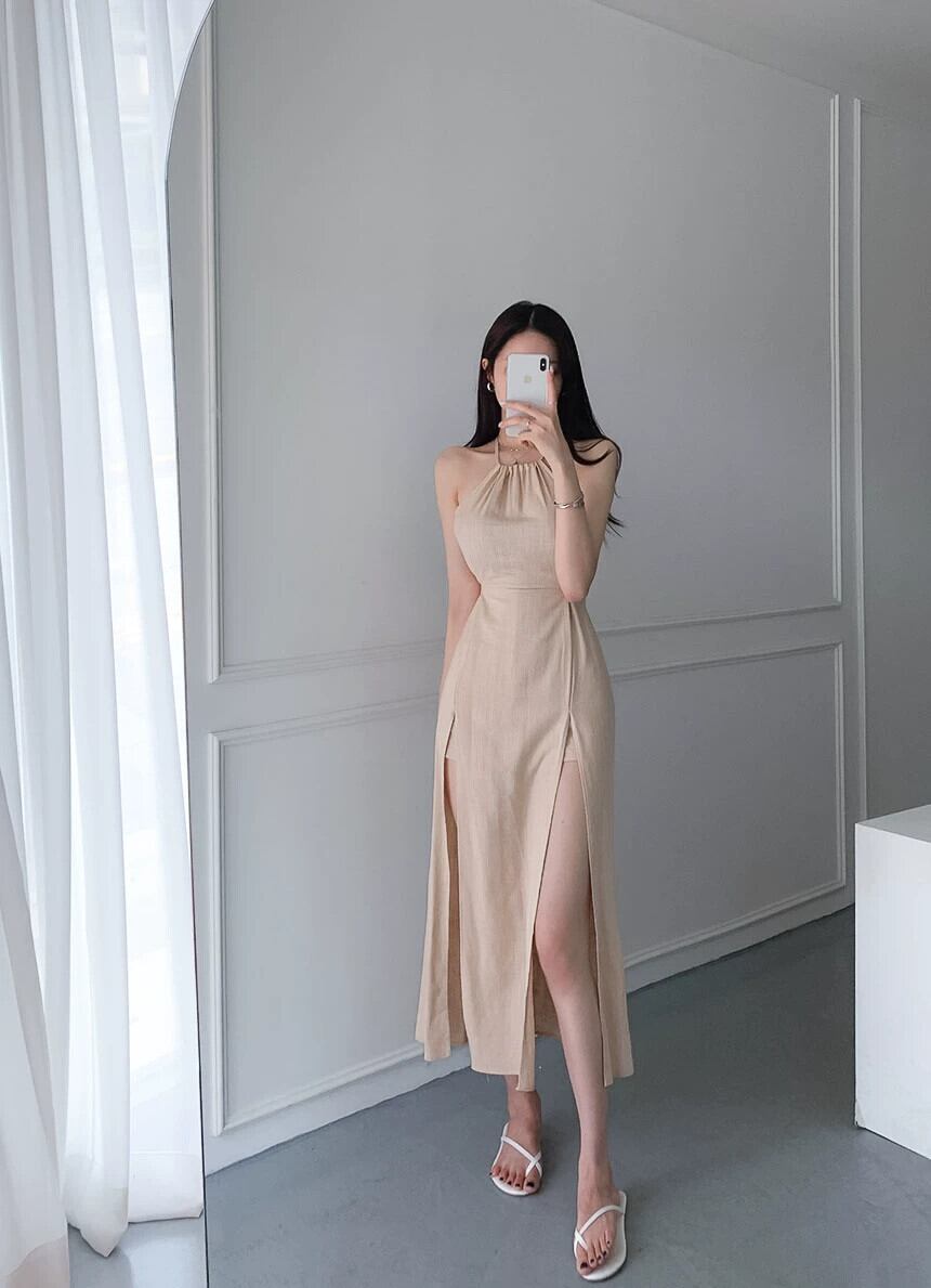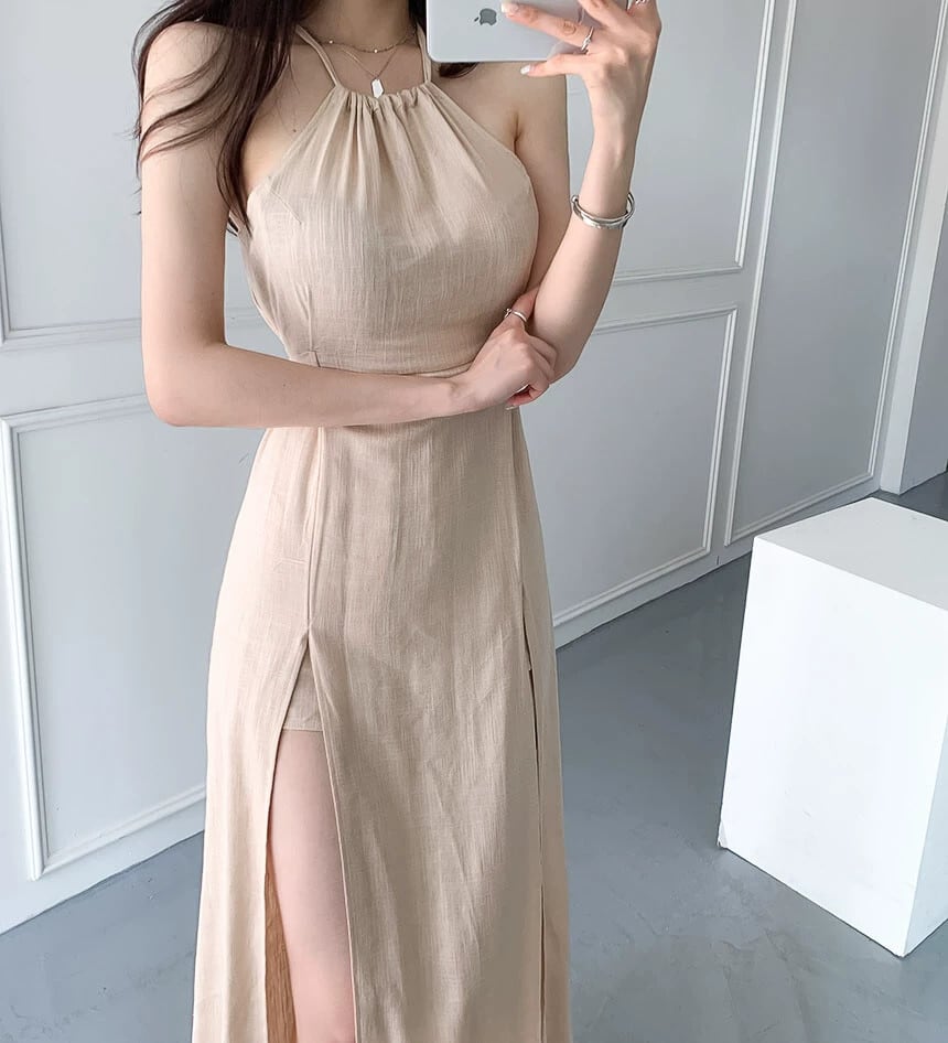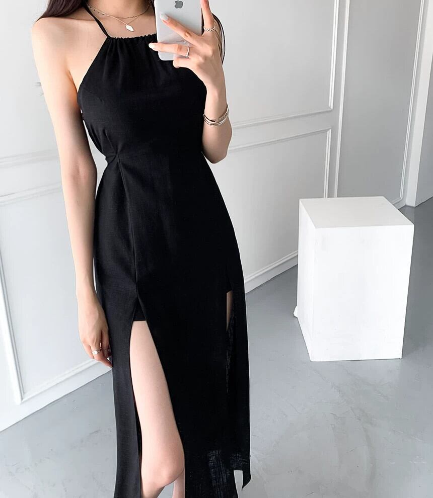 シックでユニークなホルターネックニッチロングスカートデザイン感ウエストスリム気質セクシーなストラップレススリットドレス女性の夏 サマー 夏物 yingd56395343573