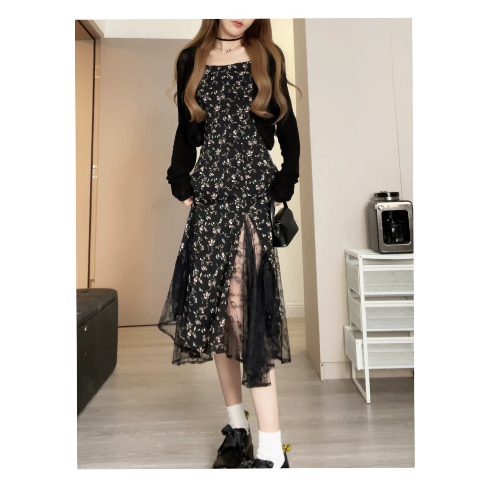 色:ブラックレースカーディガン,ホワイトレースカーディガン,ブラックカーディガン,白いカーディガン,ブラックサスペンダースカート,白いドレス