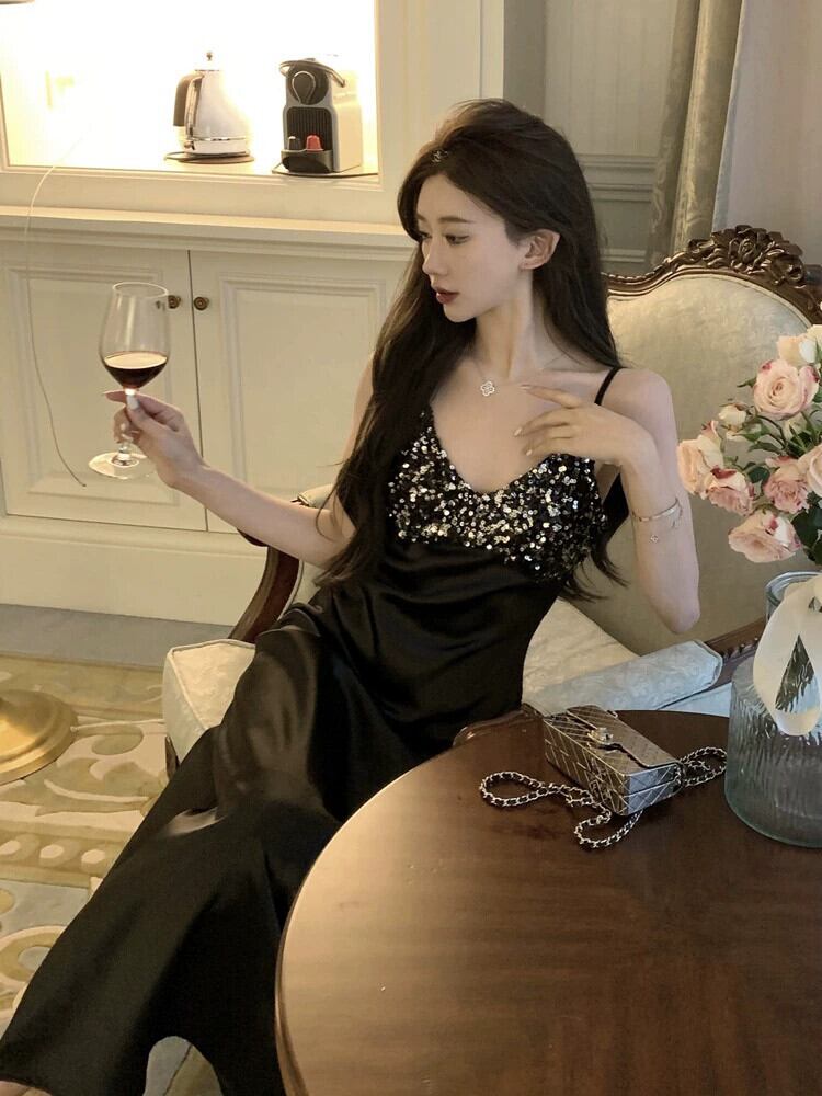 フレンチレトロブラックロングスカートデザイン感スリムウエストセクシーなVネックスパンコールストラップドレス女性の夏 サマー 夏物 yingd36227240355