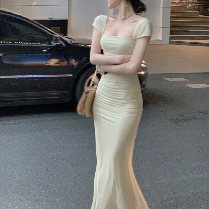 ティーブレイクフレンチウエストプリーツセクシーなバッグヒップマーメイドロングスカートフェアリーエアハイエンド絶妙なボディドレス女性の夏 サマー 夏物 yingd84624649866