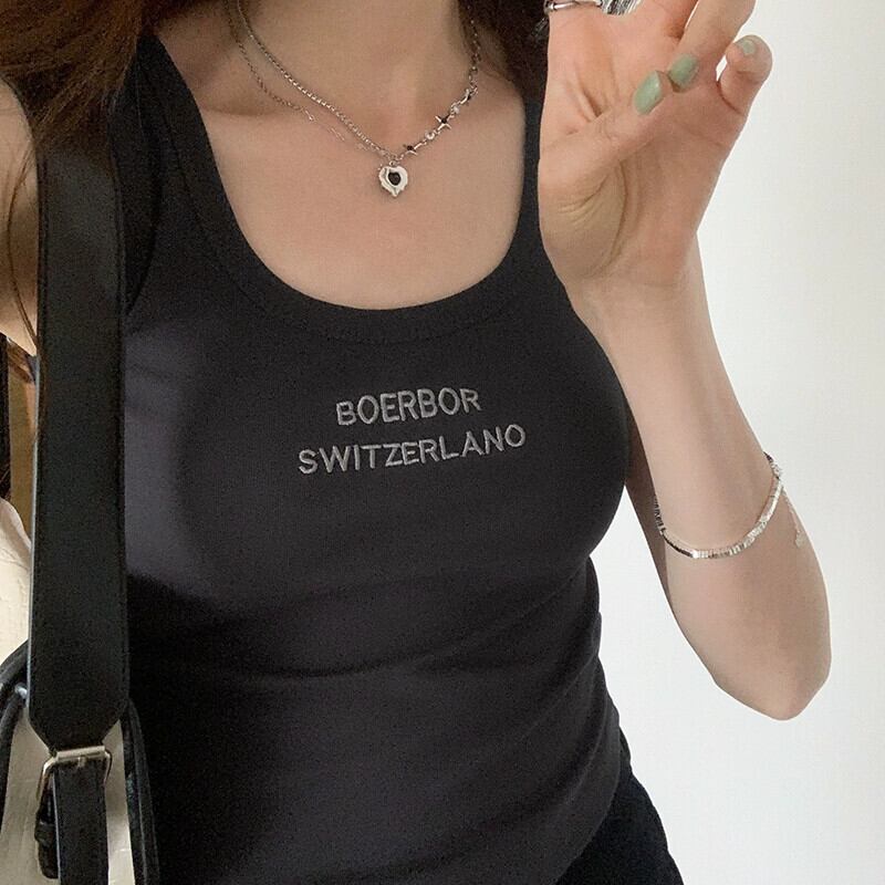 シックな甘辛アメリカンスモールキャミソールレディース刺繍文字胸カバーショート甘いクールユニークなトップスニッチ夏 レッド 大人ガーリー スウィート キュート カジュアル サマー 夏物 yingd88982328445